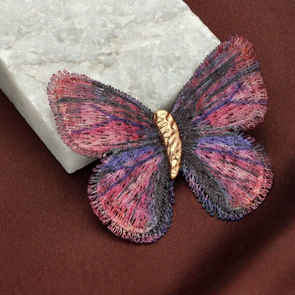 Elegancka broszka w kształcie motyla, wykonana z wyjątkową dbałością o detale. Misternie uformowane skrzydła mają strukturę przypominającą delikatny haft lub ręcznie plecione włókna, dzięki czemu całość wygląda lekko, a zarazem bardzo efektownie. Subtelne przejścia kolorystyczne nadają broszce głębi i sprawiają, że pięknie mieni się przy każdym ruchu. Każda broszka pakowana jest w prześliczne pudełeczko z wysuwaną szufladką, dzięki czemu świetnie sprawdzi się również jako gotowy prezent.
