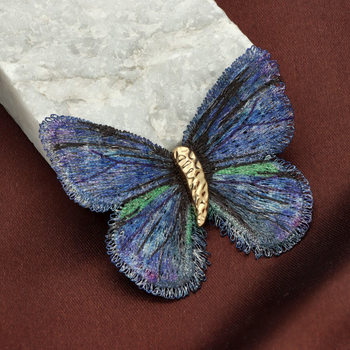 Elegancka broszka w kształcie motyla, wykonana z wyjątkową dbałością o detale. Misternie uformowane skrzydła mają strukturę przypominającą delikatny haft lub ręcznie plecione włókna, dzięki czemu całość wygląda lekko, a zarazem bardzo efektownie. Subtelne przejścia kolorystyczne nadają broszce głębi i sprawiają, że pięknie mieni się przy każdym ruchu.