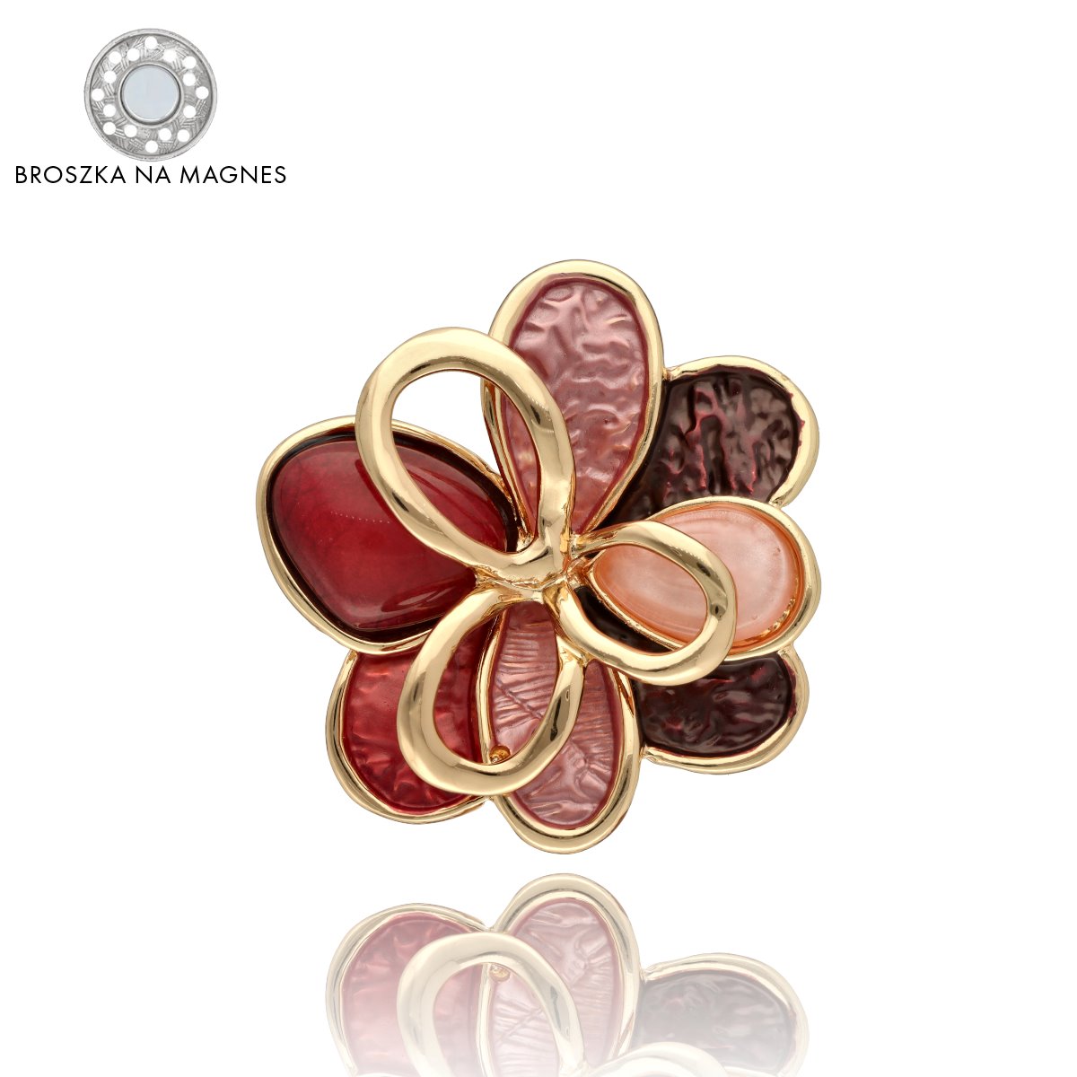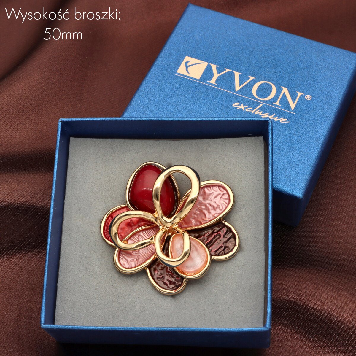 Broszka na magnes z kolekcji YVON biżuteria artystyczna, wykonana z metalu hipoalergicznego i zdobiona ręcznie nanoszoną emalią. Średnica broszki ok. 5 cm. Mocny magnes umożliwia przypięcie bez ryzyka uszkodzenia tkaniny – idealna do płaszczy, szali i torebek. Każdy egzemplarz pakowany jest w eleganckie pudełko prezentowe YVON.