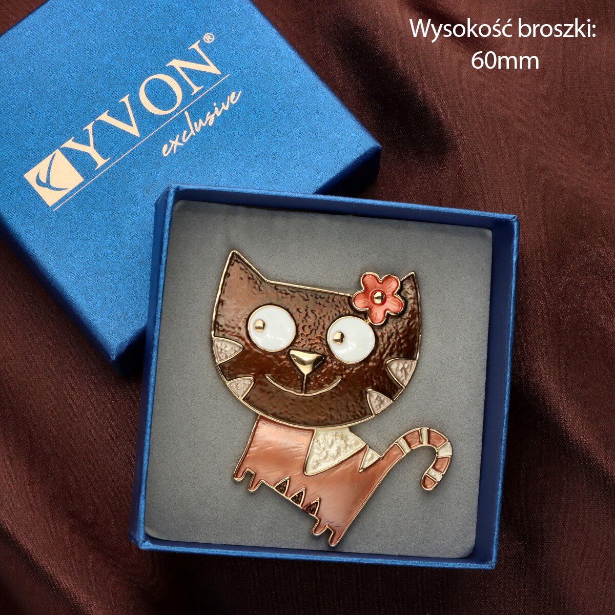 Broszka na magnes z kolekcji YVON biżuteria artystyczna, wykonana z metalu hipoalergicznego i zdobiona ręcznie nanoszoną emalią. Średnica broszki ok. 5 cm. Mocny magnes umożliwia przypięcie bez ryzyka uszkodzenia tkaniny – idealna do płaszczy, szali i torebek. Każdy egzemplarz pakowany jest w eleganckie pudełko prezentowe YVON.