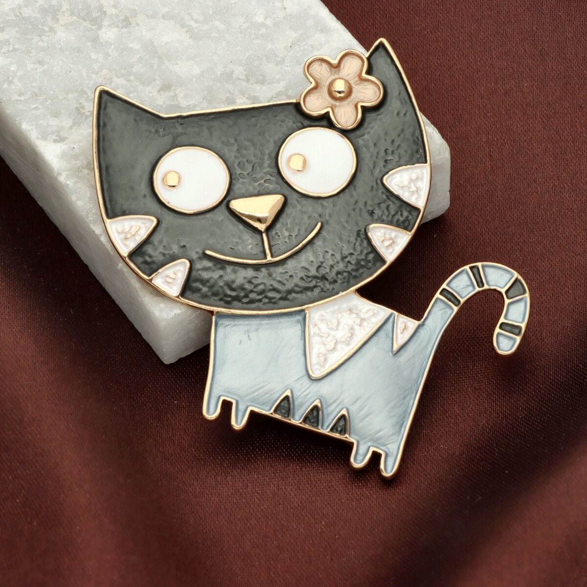 Broszka na magnes z kolekcji YVON biżuteria artystyczna, wykonana z metalu hipoalergicznego i zdobiona ręcznie nanoszoną emalią. Średnica broszki ok. 5 cm. Mocny magnes umożliwia przypięcie bez ryzyka uszkodzenia tkaniny – idealna do płaszczy, szali i torebek. Każdy egzemplarz pakowany jest w eleganckie pudełko prezentowe YVON.