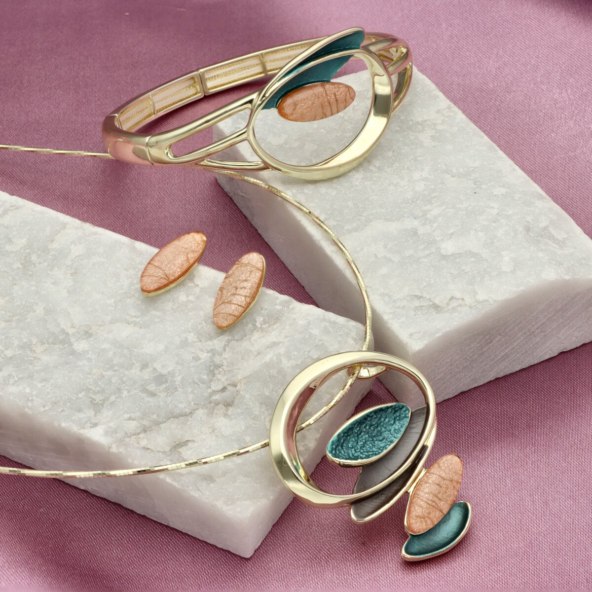 Opis produktu: Kolczyki o wielkości ok. 1,5 cm w formie smukłych, owalnych elementów. Minimalistyczna forma w połączeniu z wyrazistą strukturą nadaje im subtelnej elegancji. Wykonane z hipoalergicznego metalu (zamak – stop cynku, bezpieczny dla wrażliwej skóry) oraz żywicy z efektem głębi, która delikatnie odbija światło i nadaje im wyjątkowego charakteru. Do kompletu dostępny jest pasujący naszyjnik oraz bransoletka o tym samym indeksie numerycznym.
