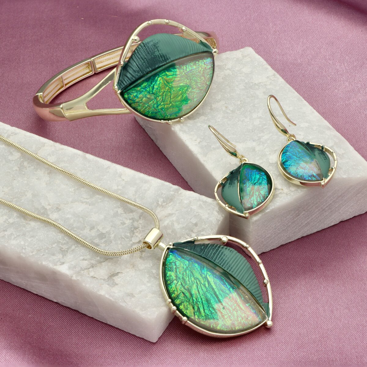 Opis produktu: Kolczyki o długości ok. 3 cm w nowoczesnej, geometrycznej formie. Ich nietypowy kształt oraz efektowne wykończenie sprawiają, że pięknie odbijają światło i wyróżniają stylizację. Wykonane z hipoalergicznego metalu (zamak – stop cynku, bezpieczny dla wrażliwej skóry), kolorowej emalii oraz żywicy z efektem głębi, mieniącej się jak opal. Do kompletu dostępny jest pasujący naszyjnik oraz bransoletka o tym samym indeksie numerycznym.