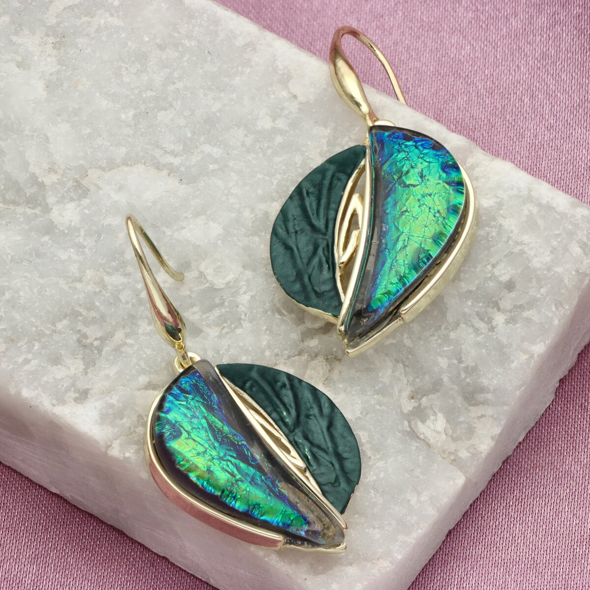 Opis produktu: Kolczyki o długości ok. 3 cm w formie nowoczesnych liści o niestandardowej, przestrzennej budowie. Ich oryginalny kształt sprawia, że pięknie odbijają światło i stanowią wyrazisty element stylizacji. Wykonane z hipoalergicznego metalu (zamak – stop cynku, bezpieczny dla wrażliwej skóry), kolorowej emalii oraz żywicy z efektem głębi, mieniącej się jak opal. Do kompletu dostępny jest pasujący naszyjnik oraz bransoletka o tym samym indeksie numerycznym.