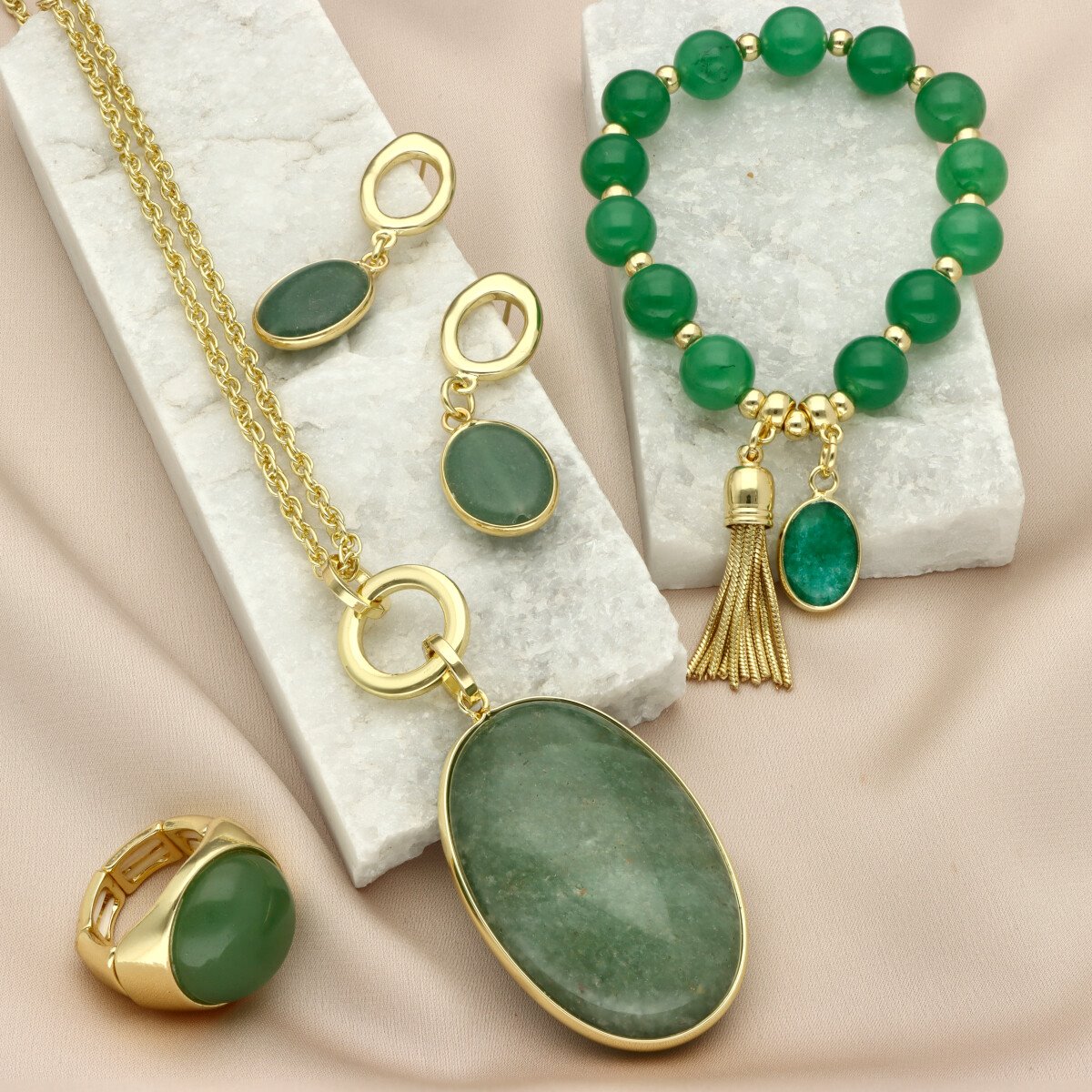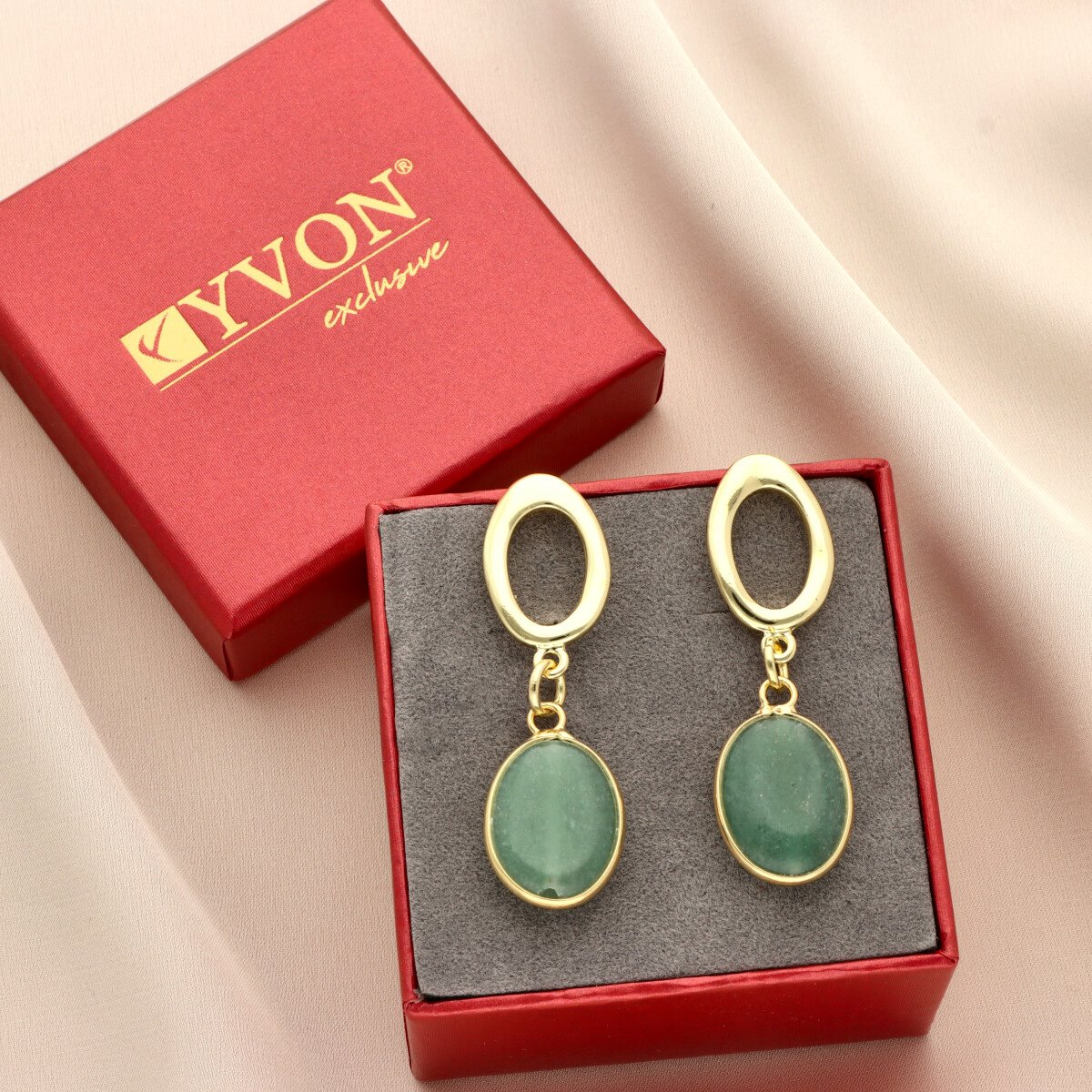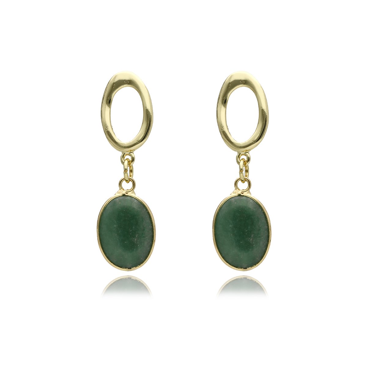 Eleganckie kolczyki z naturalnym kamieniem awenturyn to połączenie klasyki i nowoczesnej formy. Gładkie kamienie w świeżym, zielonym odcieniu w zestawieniu ze złotymi elementami tworzą wyrazistą, a jednocześnie uniwersalną kompozycję.