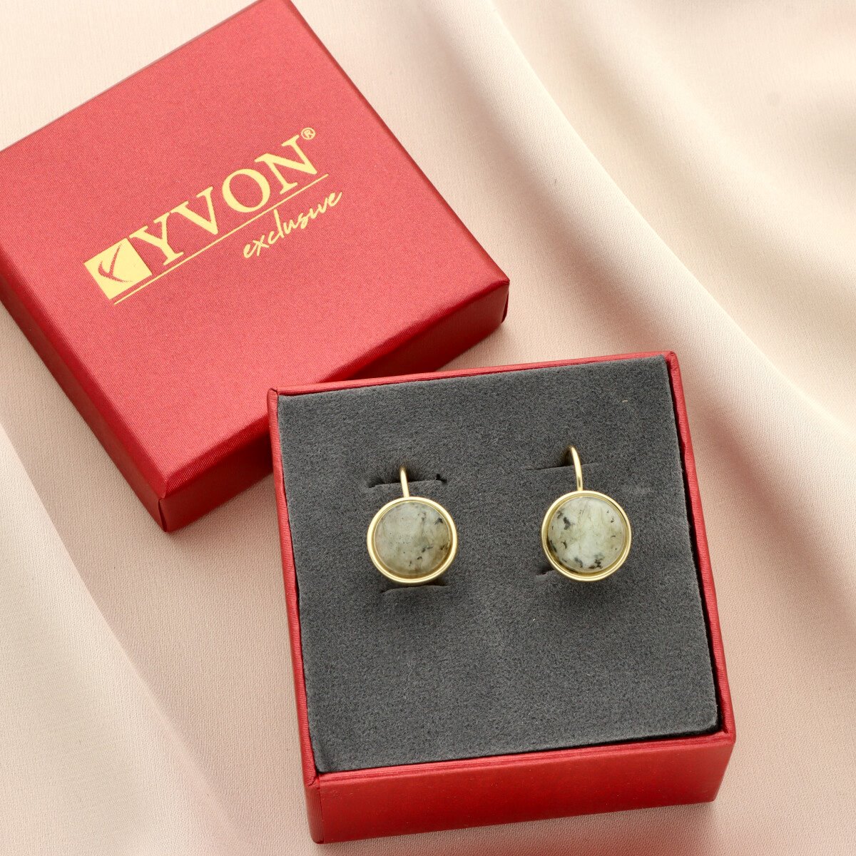 Eleganckie kolczyki z naturalnym kamieniem labradoryt to połączenie klasyki i nowoczesnej formy. Gładkie kamienie w szaro-zielonym odcieniu z subtelnym efektem refleksów w zestawieniu ze złotymi elementami tworzą wyrazistą, a jednocześnie uniwersalną kompozycję.