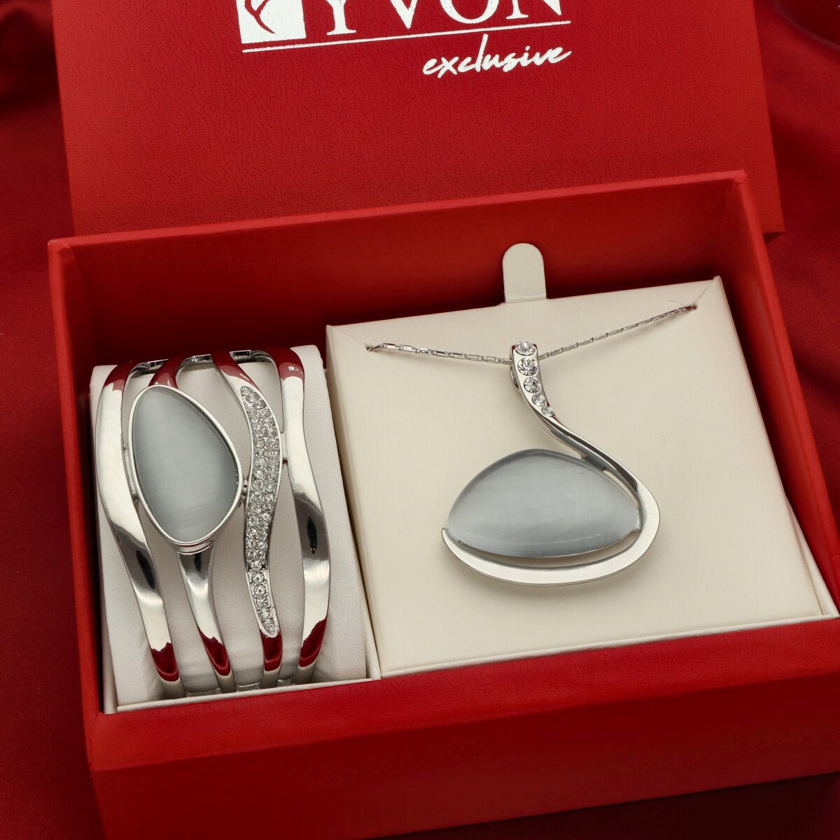 Zestaw biżuterii Calista z kolekcji YVON Exclusive to propozycja dla kobiet, które kochają elegancję w mocnym wydaniu. Komplet wykonany jest z wysokiej jakości zamaku – hipoalergicznego stopu metali, oraz ozdobiony naturalnym kwarcem i błyszczącymi cyrkoniami. Imponująca bransoleta o rzeźbiarskiej formie i dopasowany naszyjnik tworzą harmonijną, luksusową całość. Biżuteria jest w 100% hipoalergiczna, bez niklu, kadmu i ołowiu. Naszyjnik ma długość 45 cm + 8 cm regulacja, a bransoletka jest rozchylana, co ułatwia zakładanie i dopasowanie do nadgarstka. Całość zaprezentowana w eleganckim, czerwonym pudełku prezentowym YVON, które jest gratis.