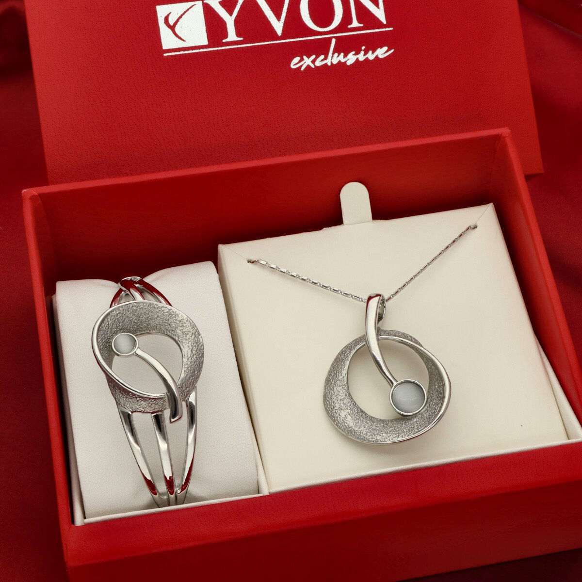 Zestaw biżuterii Eloria z kolekcji YVON Exclusive to elegancki komplet wykonany z wysokiej jakości zamaku – hipoalergicznego stopu metali stosowanego w jubilerstwie. Subtelne elementy ozdobne uzupełnia naturalny kamień kwarcu, który dodaje całości szlachetnego charakteru. Lekko matowa, szczotkowana powierzchnia metalu pięknie kontrastuje z gładkim połyskiem detali, tworząc nowoczesny, a zarazem ponadczasowy efekt.