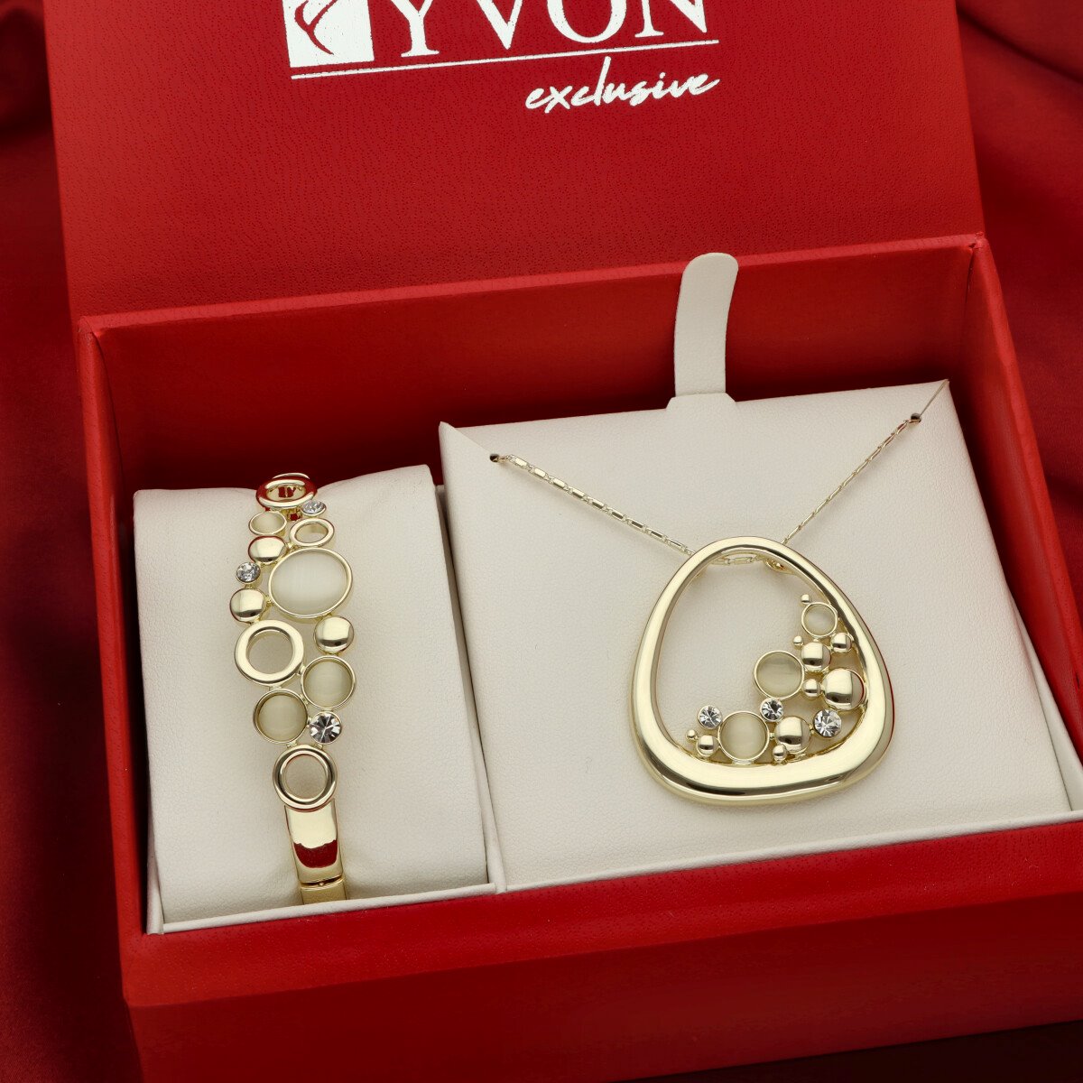 Zestaw biżuterii Lumina z kolekcji YVON Exclusive to elegancki komplet składający się z naszyjnika i bransoletki wykonanych z kwarcu oraz antyalergicznego stopu metali – zamaku. Zamak to trwały materiał jubilerski o wysokiej odporności na korozję i zachowanie połysku. Wszystkie elementy zostały starannie wykończone i zaprezentowane w dużym, czerwonym pudełku prezentowym YVON. Biżuteria jest w 100% antyalergiczna i bezpieczna dla skóry. Naszyjnik ma długość 45 cm + 8 cm regulacja, bransoletka posiada rozmiar uniwersalny na elastycznych gumkach, dopasowujących się do każdej ręki. Dekoracyjne pudełko prezentowe YVON jest gratis.