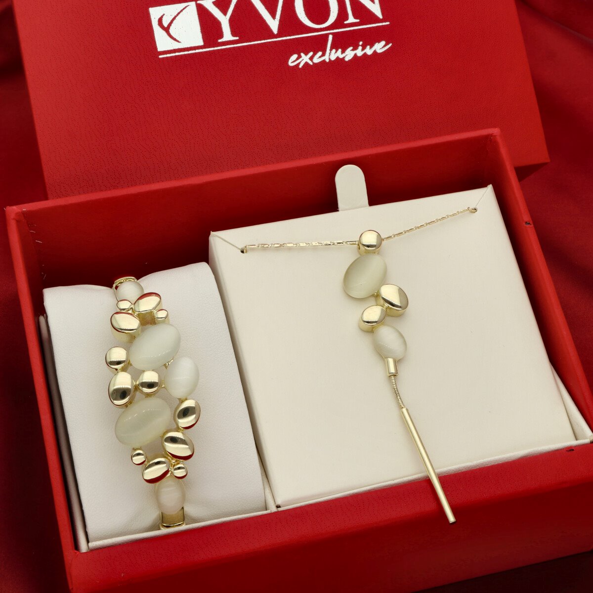 Zestaw biżuterii Lumina z kolekcji YVON Exclusive to elegancki komplet składający się z naszyjnika i bransoletki wykonanych z kwarcu oraz antyalergicznego stopu metali – zamaku. Zamak to trwały materiał jubilerski o wysokiej odporności na korozję i zachowanie połysku. Wszystkie elementy zostały starannie wykończone i zaprezentowane w dużym, czerwonym pudełku prezentowym YVON. Biżuteria jest w 100% antyalergiczna i bezpieczna dla skóry. Naszyjnik ma długość 45 cm + 8 cm regulacja, bransoletka posiada rozmiar uniwersalny na elastycznych gumkach, dopasowujących się do każdej ręki. Dekoracyjne pudełko prezentowe YVON jest gratis.