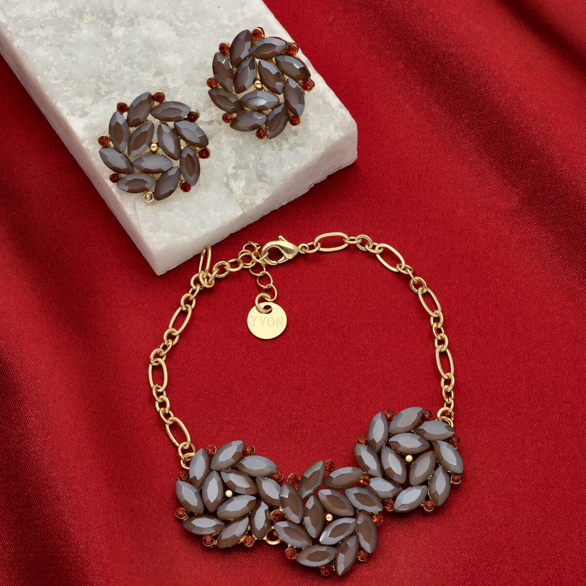 Uroczy, niezwykle kobiecy zestaw biżuterii wizytowej, który subtelnie podkreśla elegancję stylizacji. Komplet składa się z regulowanej bransoletki oraz efektownych kolczyków o długości ok 3 cm, które pięknie wysmuklają szyję i dodają lekkości całej sylwetce. Biżuteria została wykonana z metalu HIPOALERGICZNEGO oraz szkła fasetowanego dymionego, dzięki czemu delikatnie odbija światło i tworzy elegancki, szlachetny efekt. To idealna propozycja na przyjęcia, uroczystości rodzinne, wesela oraz inne wyjątkowe okazje. Całość zapakowana jest w prześliczne PUDEŁKO, dzięki czemu komplet doskonale sprawdzi się również jako gotowy pomysł na PREZENT.