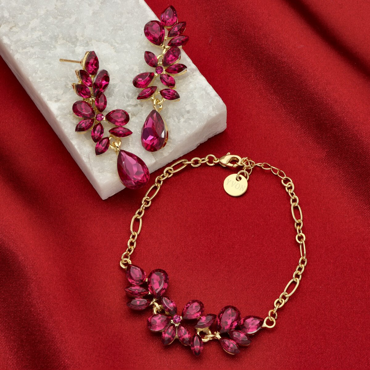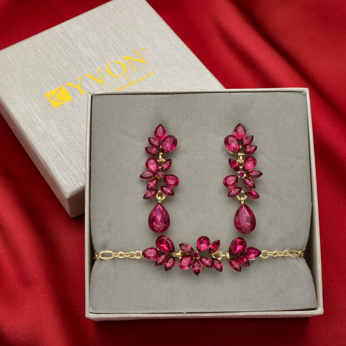 Uroczy, niezwykle kobiecy zestaw biżuterii wizytowej, który subtelnie podkreśla elegancję stylizacji. Komplet składa się z regulowanej bransoletki oraz efektownych kolczyków o długości 6 cm, które pięknie wysmuklają szyję i dodają lekkości całej sylwetce. Biżuteria została wykonana z metalu HIPOALERGICZNEGO oraz szkła fasetowanego, dzięki czemu pięknie odbija światło i tworzy elegancki, szlachetny efekt. To idealna propozycja na przyjęcia, uroczystości rodzinne, wesela oraz inne wyjątkowe okazje. Całość zapakowana jest w prześliczne PUDEŁKO, dzięki czemu komplet doskonale sprawdzi się również jako gotowy pomysł na PREZENT.