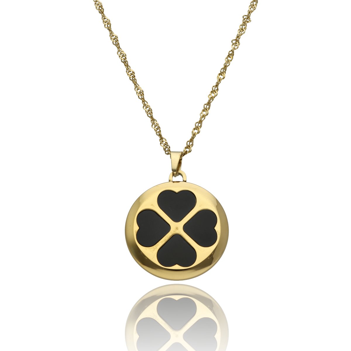 Naszyjnik typu medalion wykonany z wysokogatunkowej, hipoalergicznej stali szlachetnej 316L, pozłacanej 16-karatowym złotem. Charakteryzuje się wyjątkową odpornością na ścieranie, zmatowienie i działanie wilgoci.