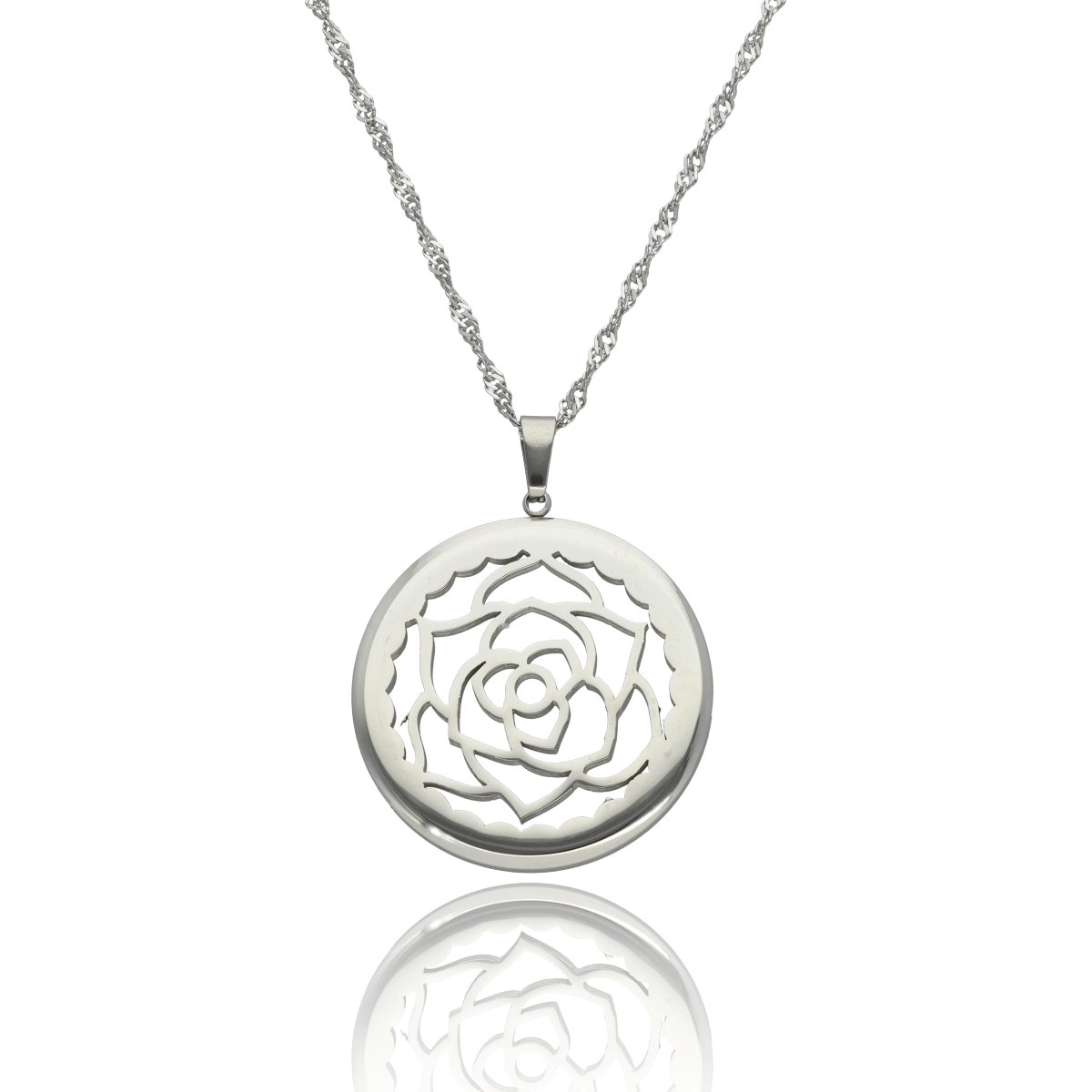 Naszyjnik wykonany z hipoalergicznej stali szlachetnej 316L o wysokim połysku i odporności na ścieranie. Zawieszka o średnicy 3 cm została umieszczona na ozdobnym łańcuszku o długości 60 cm + 5 cm regulacji.