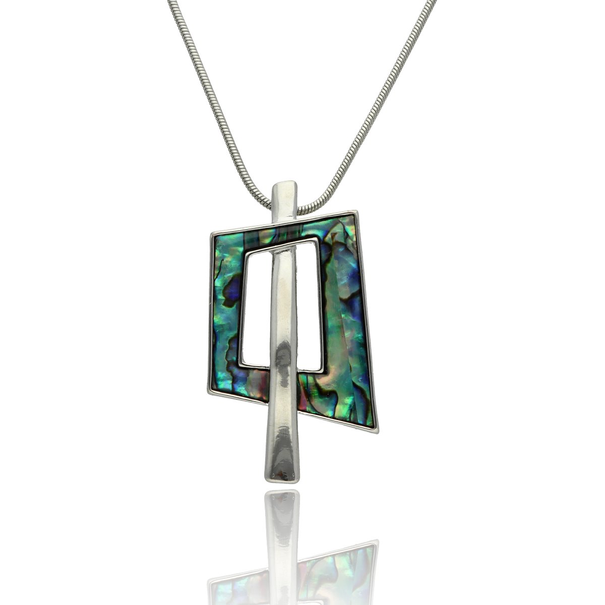Elegancki, krótki naszyjnik wykonany z metalu antyalergicznego, ozdobiony efektowną zawieszką o długości ok. 5 cm. Zawieszka została wykonana z naturalnej muszli Abalonej, tworząc harmonijne, przyciągające uwagę połączenie.
