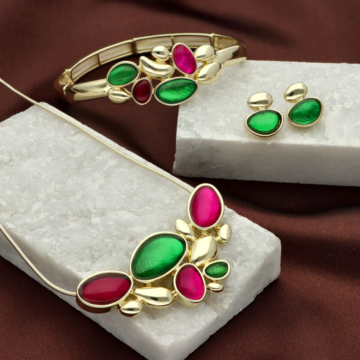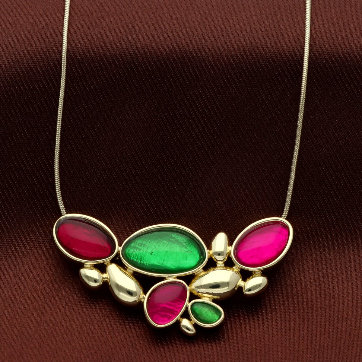 Uroczy, dekoltowy naszyjnik wykonany z antyalergicznego metalu i kolorowej żywicy z efektem głębi. Długość 45 cm + 8 cm regulacja. Szukaj do kompletu bransoletki i kolczyków o tym samym indeksie numerycznym.