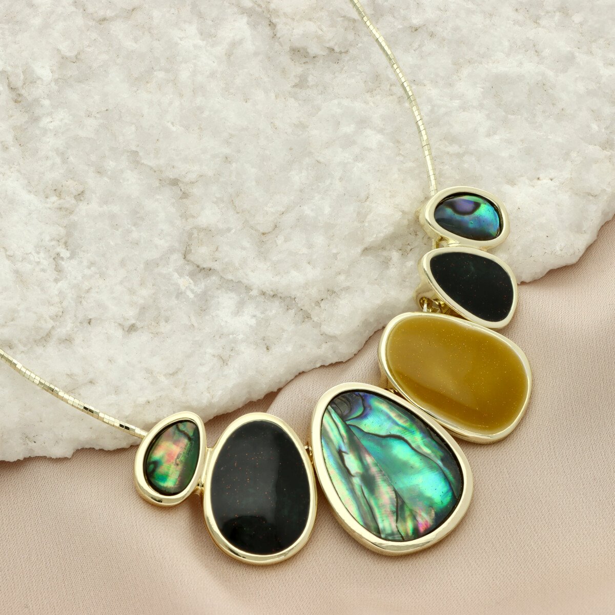 Opis produktu: Naszyjnik o długości 42 cm + 8 cm przedłużki, z ozdobnym elementem o szerokości w najszerszym miejscu ok. 2,5 cm. Kompozycja nieregularnych form tworzy harmonijną, artystyczną całość, która przyciąga spojrzenie i nadaje biżuterii wyrafinowanego charakteru. Naszyjnik wykonany z hipoalergicznego metalu (zamak – stop cynku, bezpieczny dla wrażliwej skóry), ozdobiony naturalną muszlą, kolorową emalią oraz żywicą z efektem głębi. Powierzchnia muszli subtelnie mieni się w świetle, tworząc elegancki efekt inspirowany opalem, a całość prezentuje się wyjątkowo szlachetnie. Do kompletu szukaj pasującej bransoletki i kolczyków o tym samym indeksie numerycznym.
