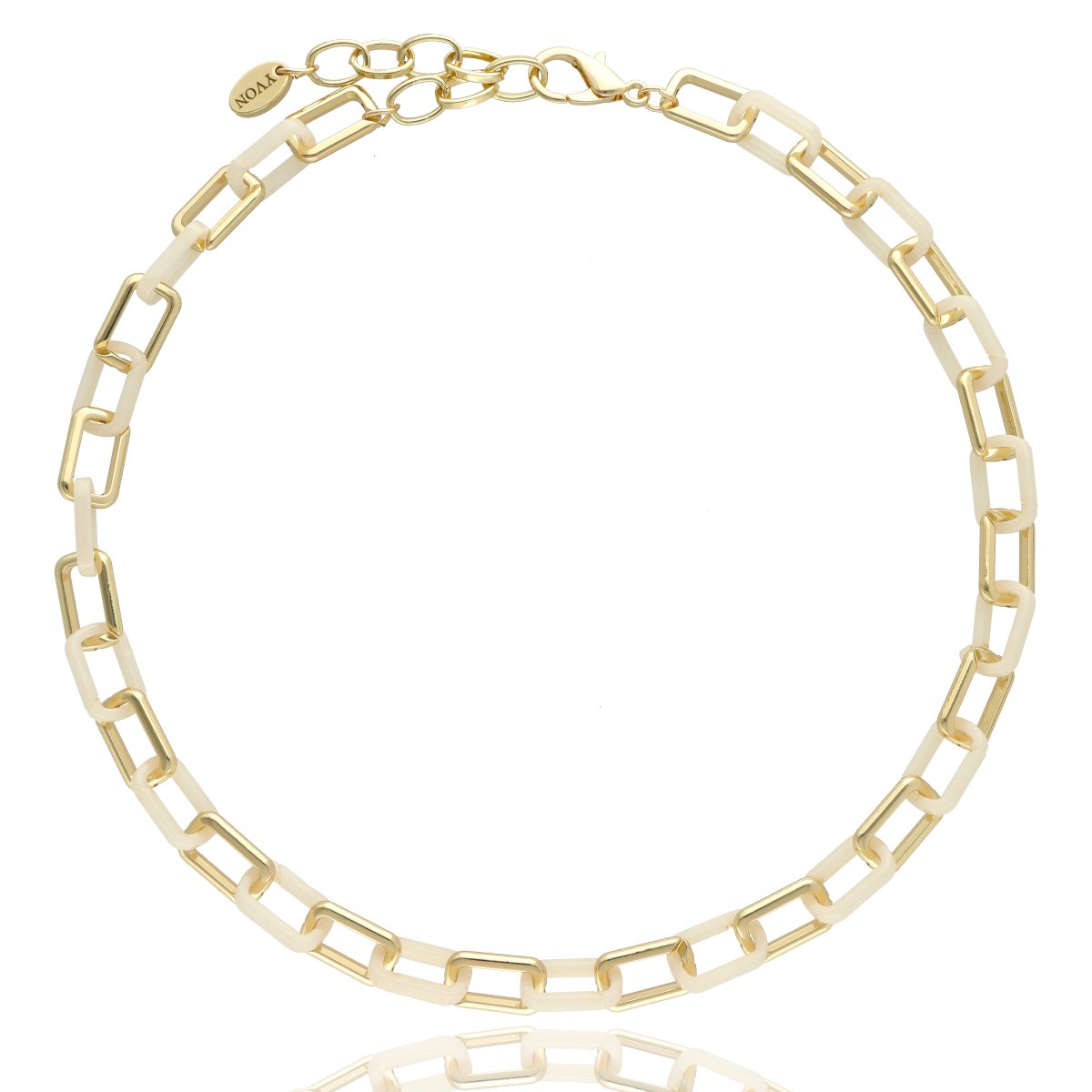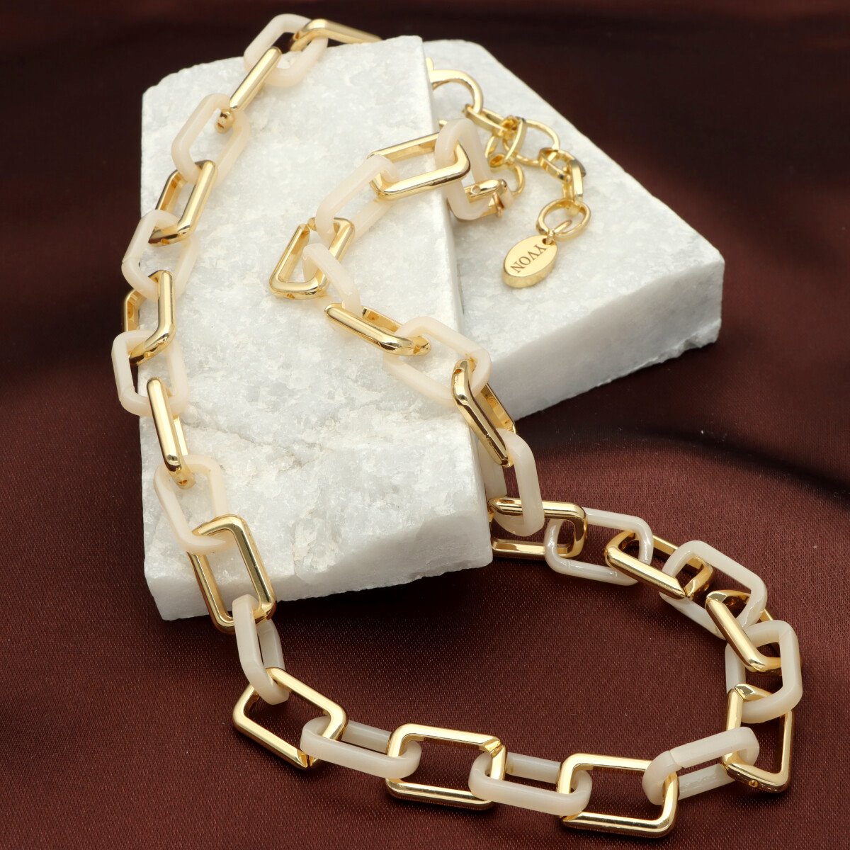 Naszyjnik wykonany z wysokiej jakości zamaku (hypoalergiczny stop cynku) oraz barwionej żywicy w ciepłych odcieniach kolorów ziemi. Ogniwa tworzą nowoczesną, a jednocześnie elegancką kompozycję, która podkreśla charakter każdej stylizacji. Długość naszyjnika wynosi 42 cm z możliwością regulacji, co pozwala na idealne dopasowanie do dekoltu. To propozycja dla kobiet ceniących biżuterię stylową i pełną wyrazu. Do kompletu dostępna jest także bransoletka w tym samym wzorze – razem tworzą wyjątkowy zestaw.