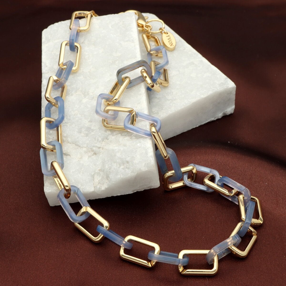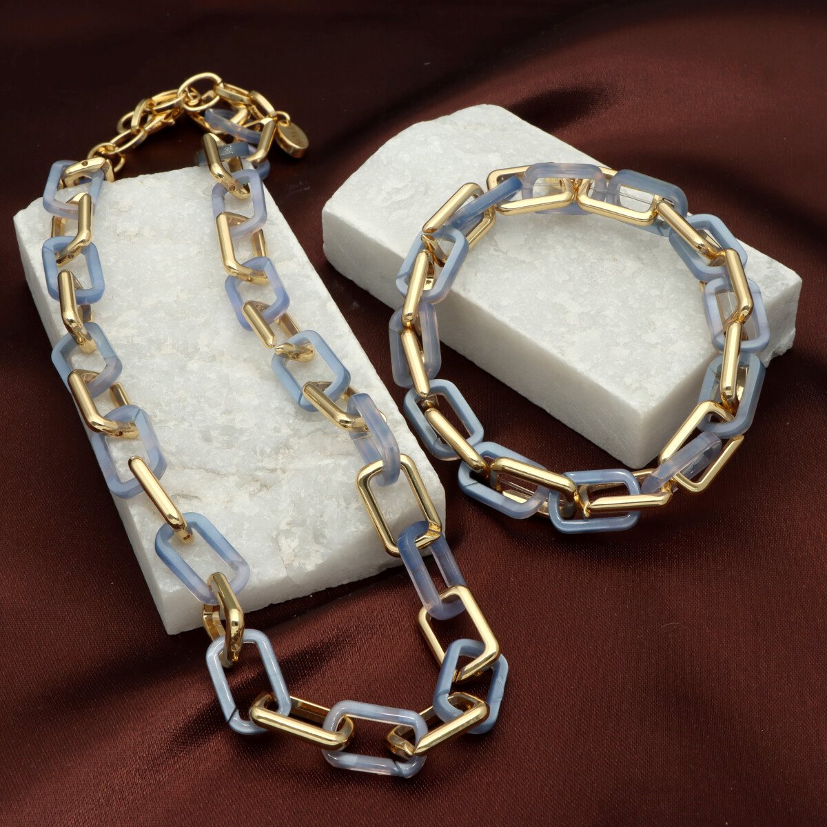 Naszyjnik wykonany z wysokiej jakości zamaku (hypoalergiczny stop cynku) oraz barwionej żywicy w ciepłych odcieniach kolorów ziemi. Ogniwa tworzą nowoczesną, a jednocześnie elegancką kompozycję, która podkreśla charakter każdej stylizacji. Długość naszyjnika wynosi 42 cm z możliwością regulacji, co pozwala na idealne dopasowanie do dekoltu. To propozycja dla kobiet ceniących biżuterię stylową i pełną wyrazu. Do kompletu dostępna jest także bransoletka w tym samym wzorze – razem tworzą wyjątkowy zestaw.