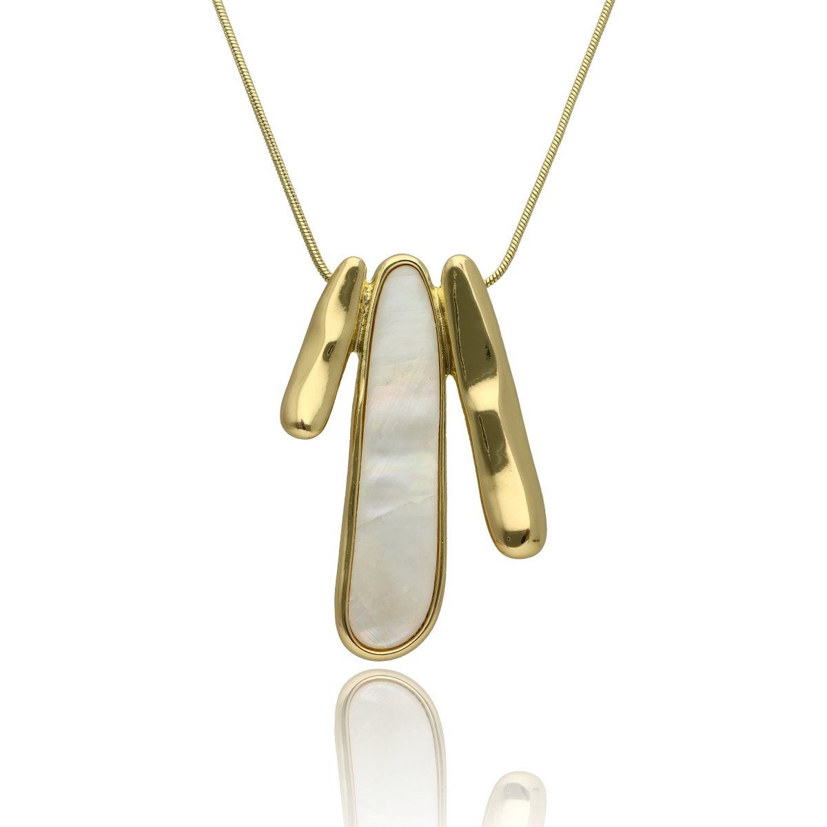 Elegancki, krótki naszyjnik wykonany z metalu antyalergicznego, ozdobiony efektowną zawieszką o długości ok. 5 cm. Zawieszka została wykonana z naturalnej muszli mlecznej, tworząc harmonijne, przyciągające uwagę połączenie.