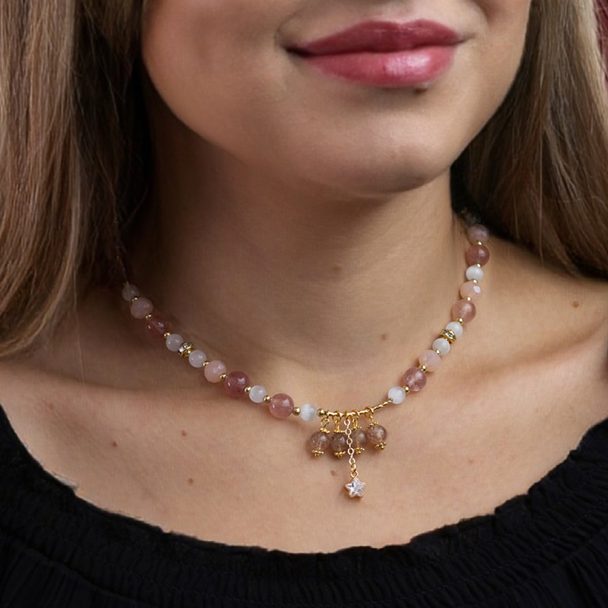 Ekskluzywny naszyjnik z kolekcji LOVELY STONES wykonany z najwyższej jakości mosiądzu oraz kamienia Sunstone i kryształu górskiego. Długość: 42 cm + regulacja.