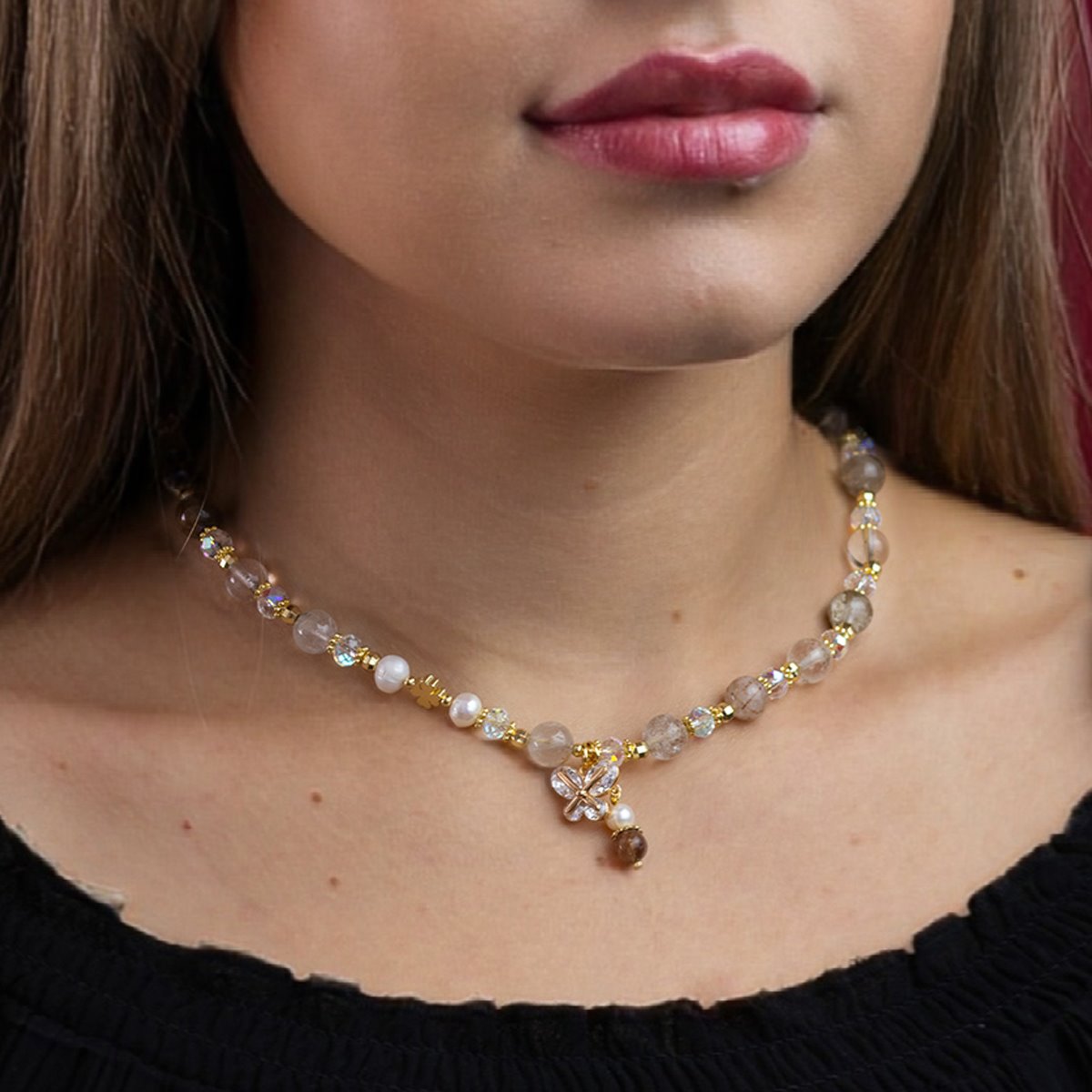 Ekskluzywny naszyjnik z kolekcji LOVELY STONES wykonany z najwyższej jakości mosiądzu oraz kwarcu rutylowego, kryształu górskiego, cyrkonii. Długość: 42 cm + regulacja.