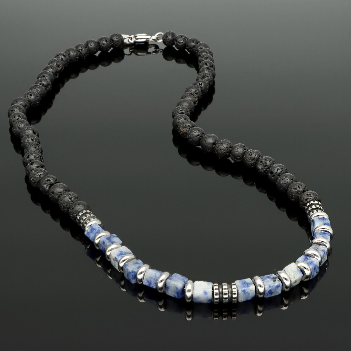 Naszyjnik męski YVES wykonany ze stali szlachetnej i naturalnych kamieni – agatu i sodalitu. Długość 45 cm, wykończony w sposób gwarantujący wygodę codziennego noszenia. Stal 316L jest w pełni hypoalergiczna, odporna na zarysowania i utratę koloru. Naszyjnik zapakowany w eleganckie pudełko, idealny na prezent. Model doskonale komponuje się z bransoletą o tym samym indeksie.