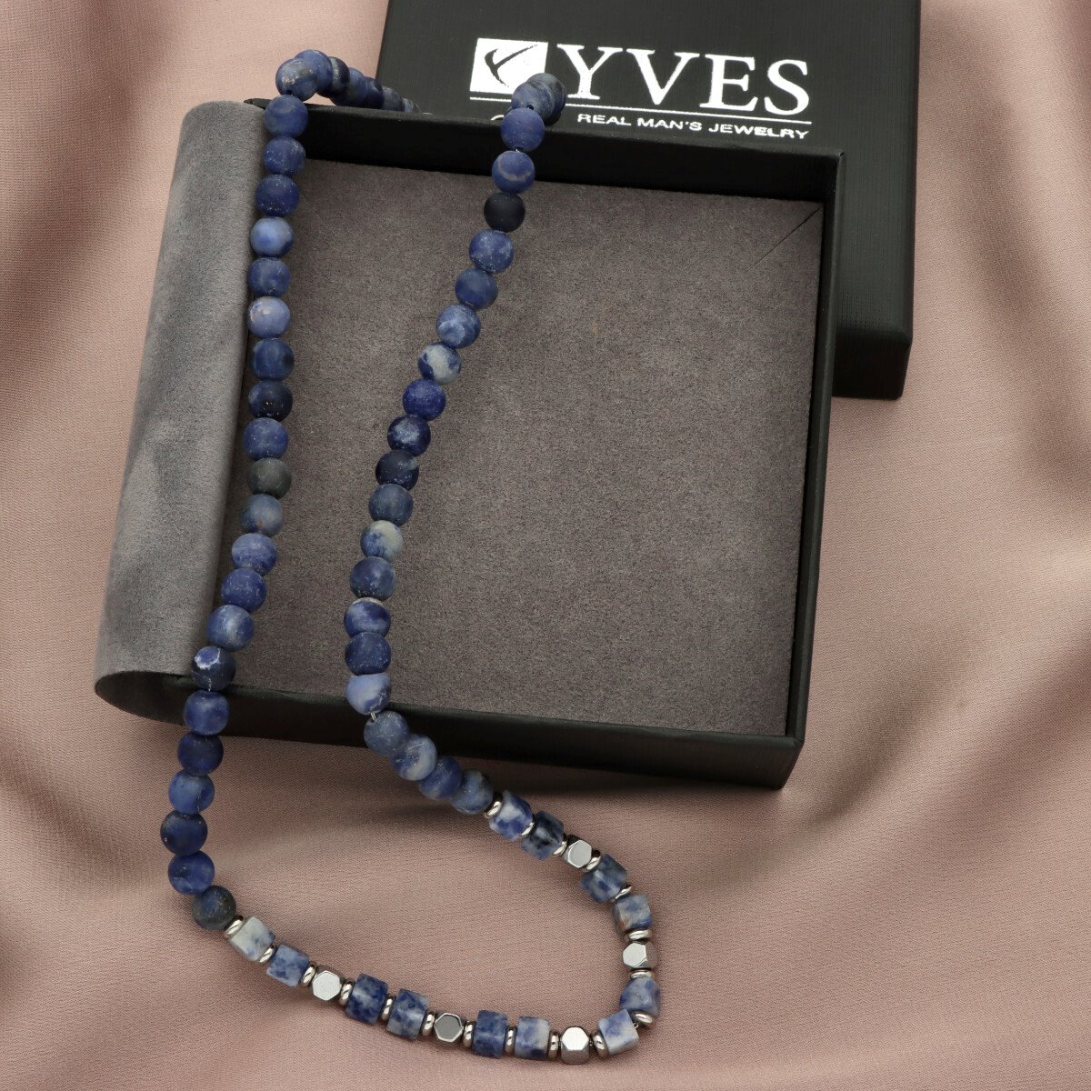 Naszyjnik męski YVES wykonany ze stali szlachetnej i naturalnych kamieni – sodalitu. Długość 45 cm, wykończony w sposób gwarantujący wygodę codziennego noszenia. Stal 316L jest w pełni antyalergiczna, odporna na zarysowania i utratę koloru. Naszyjnik zapakowany w eleganckie pudełko, idealny na prezent. Model doskonale komponuje się z bransoletą o tym samym indeksie.