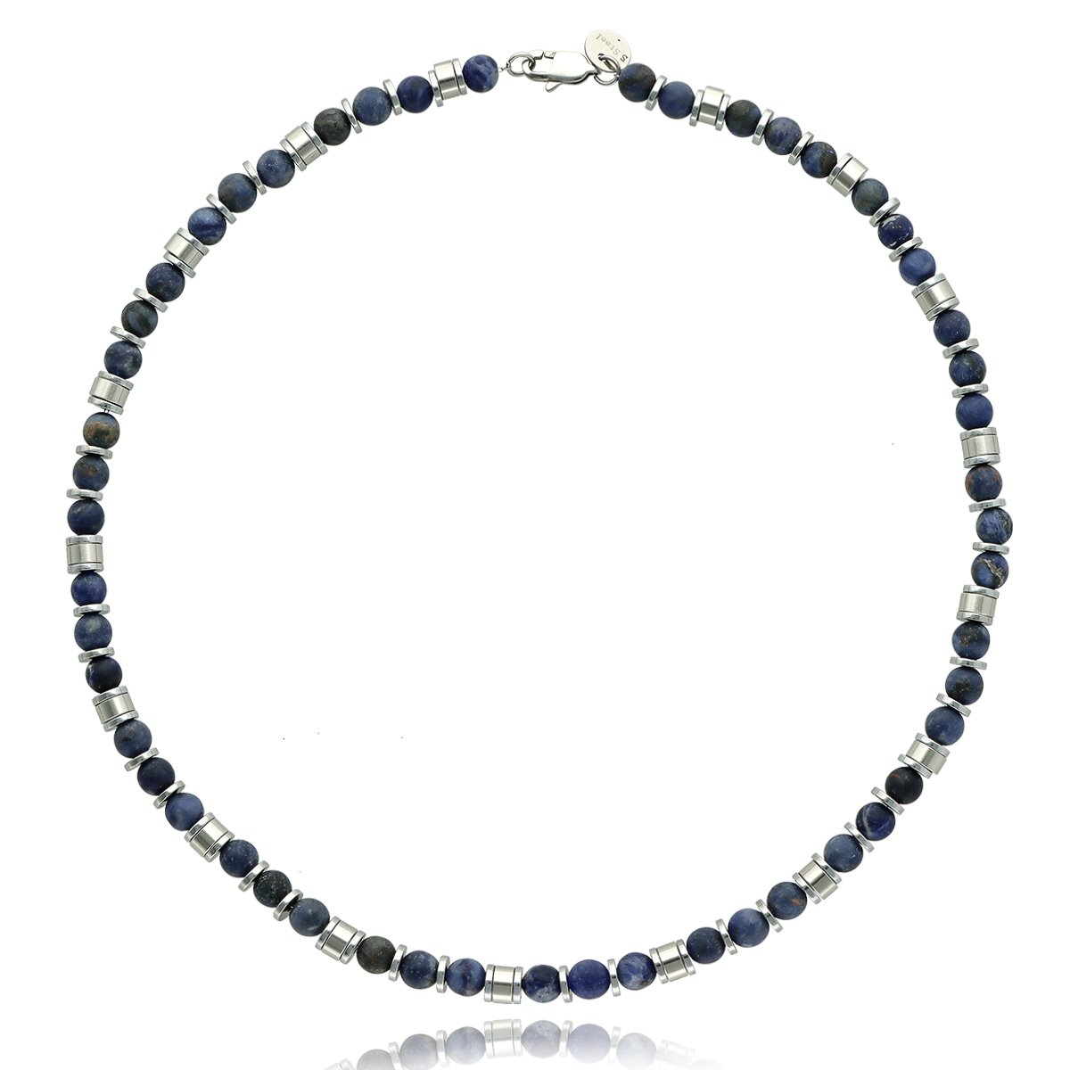Naszyjnik męski YVES wykonany ze stali szlachetnej i naturalnych kamieni – sodalitu. Długość 45 cm, wykończony w sposób gwarantujący wygodę codziennego noszenia. Stal 316L jest w pełni antyalergiczna, odporna na zarysowania i utratę koloru. Naszyjnik zapakowany w eleganckie pudełko, idealny na prezent. Model doskonale komponuje się z bransoletą o tym samym indeksie.