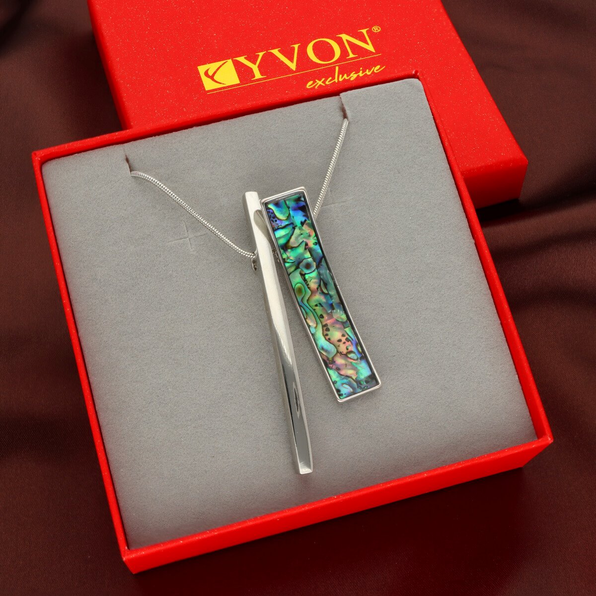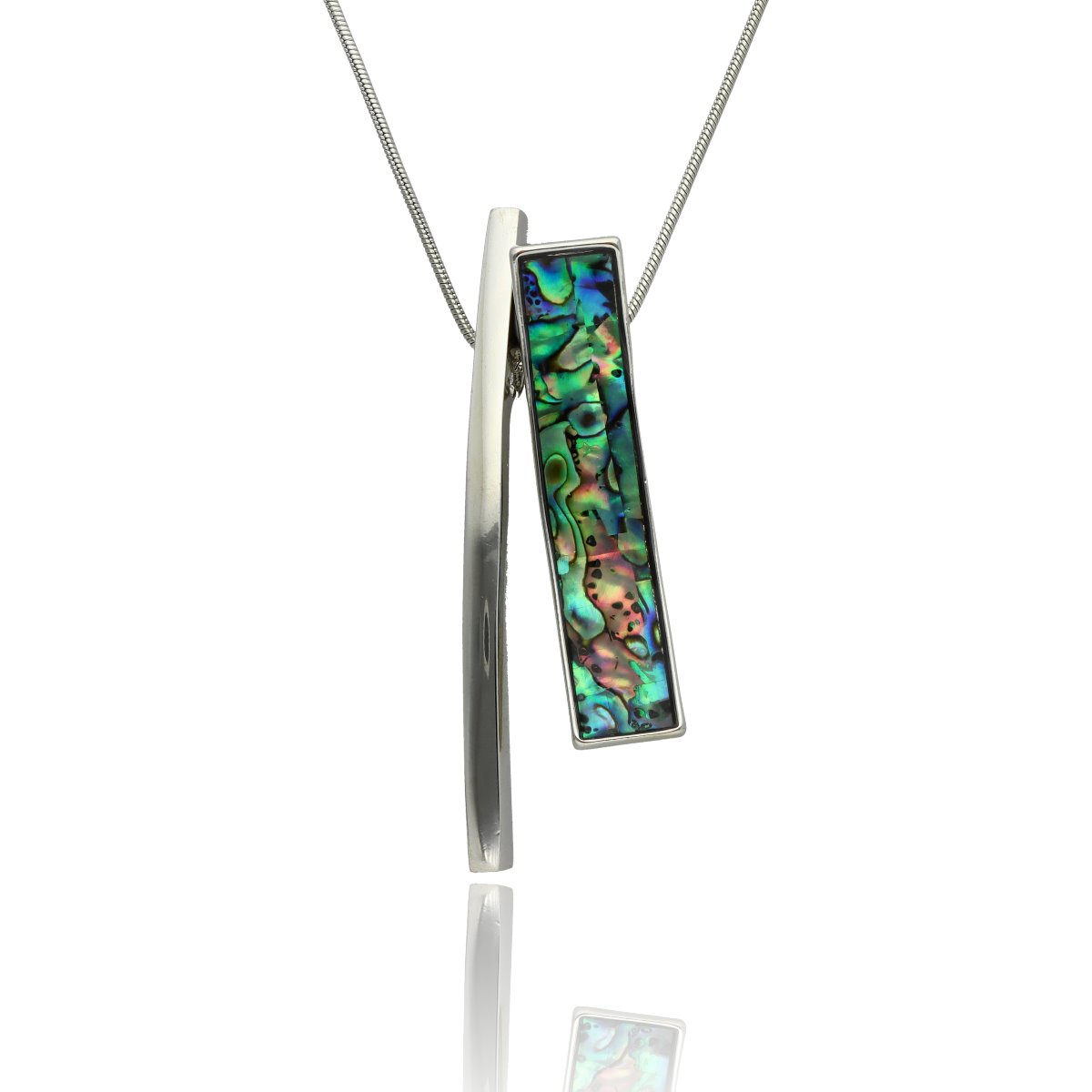 Elegancki, długi naszyjnik wykonany z metalu antyalergicznego, ozdobiony efektowną zawieszką o długości ok. 5 cm. Zawieszka została wykonana z naturalnej muszli Abalonej, tworząc harmonijne, przyciągające uwagę połączenie.