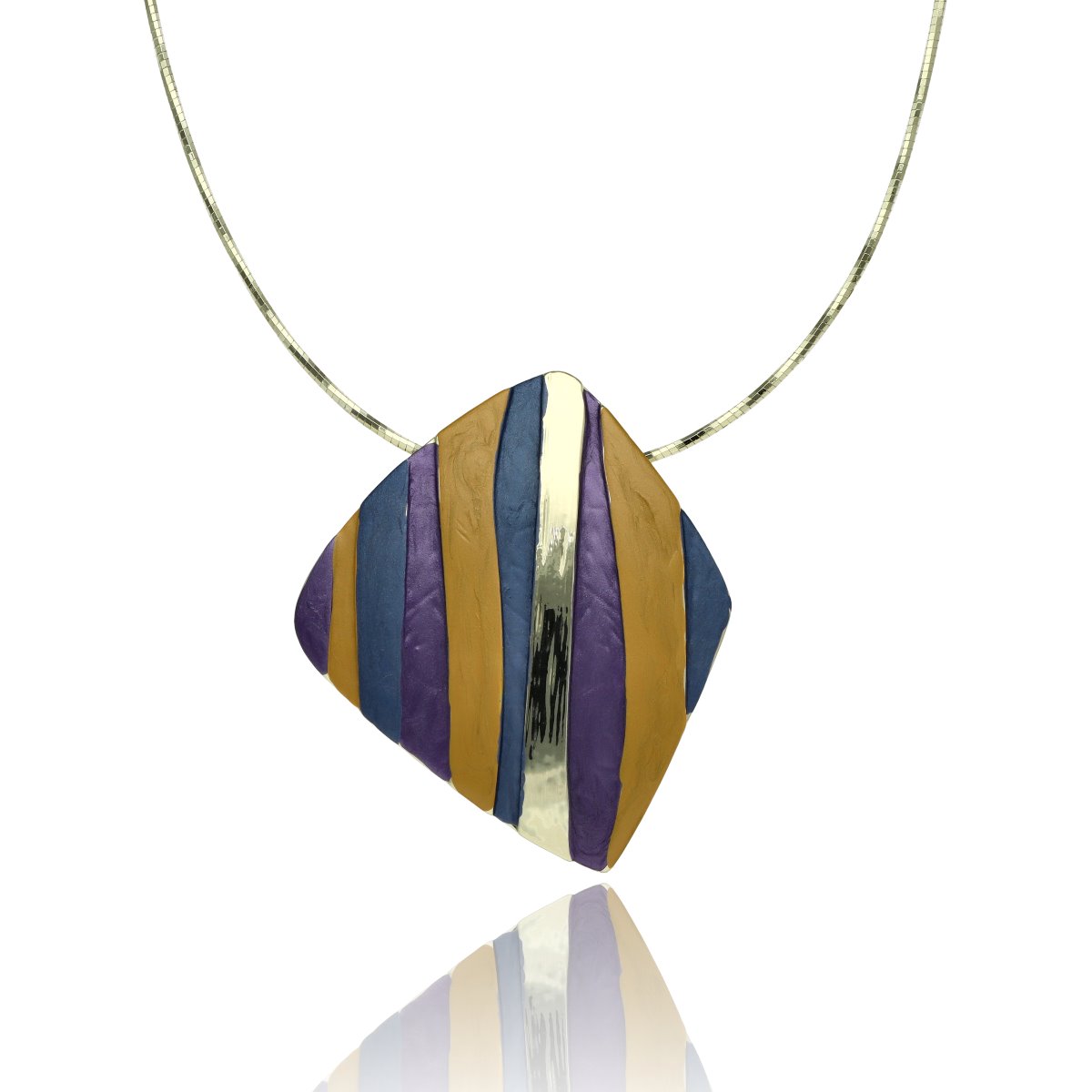 Opis produktu: Naszyjnik o długości 42 cm + 8 cm przedłużki, z ozdobnym elementem o szerokości ok. 5 cm. Wyrazista, geometryczna forma z nieregularnymi pasami tworzy nowoczesną, artystyczną kompozycję, która przyciąga uwagę i nadaje biżuterii unikalnego charakteru. Naszyjnik wykonany z hipoalergicznego metalu (zamak – stop cynku, bezpieczny dla wrażliwej skóry), ozdobiony kolorową emalią o delikatnej strukturze i efekcie głębi. Do kompletu szukaj pasującej bransoletki, kolczyków oraz pierścionka o tym samym indeksie numerycznym.