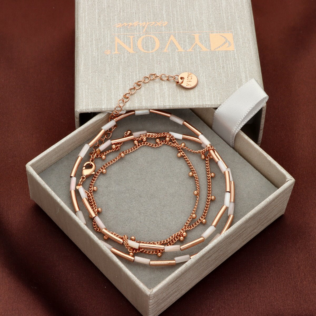 Naszyjnik wykonany z mosiądzu pozłacanego różowym złotem, ozdobiony elementami z naturalnej muszli. Subtelne połączenie łańcuszka z gładkimi, połyskującymi segmentami nadaje mu elegancki i nowoczesny charakter. Długość naszyjnika wynosi 42 cm z możliwością regulacji o dodatkowe 8 cm, co pozwala idealnie dopasować go do różnych stylizacji. Hipoalergiczny materiał gwarantuje komfort noszenia. Do kompletu dostępna jest bransoletka o tym samym indeksie numerycznym.