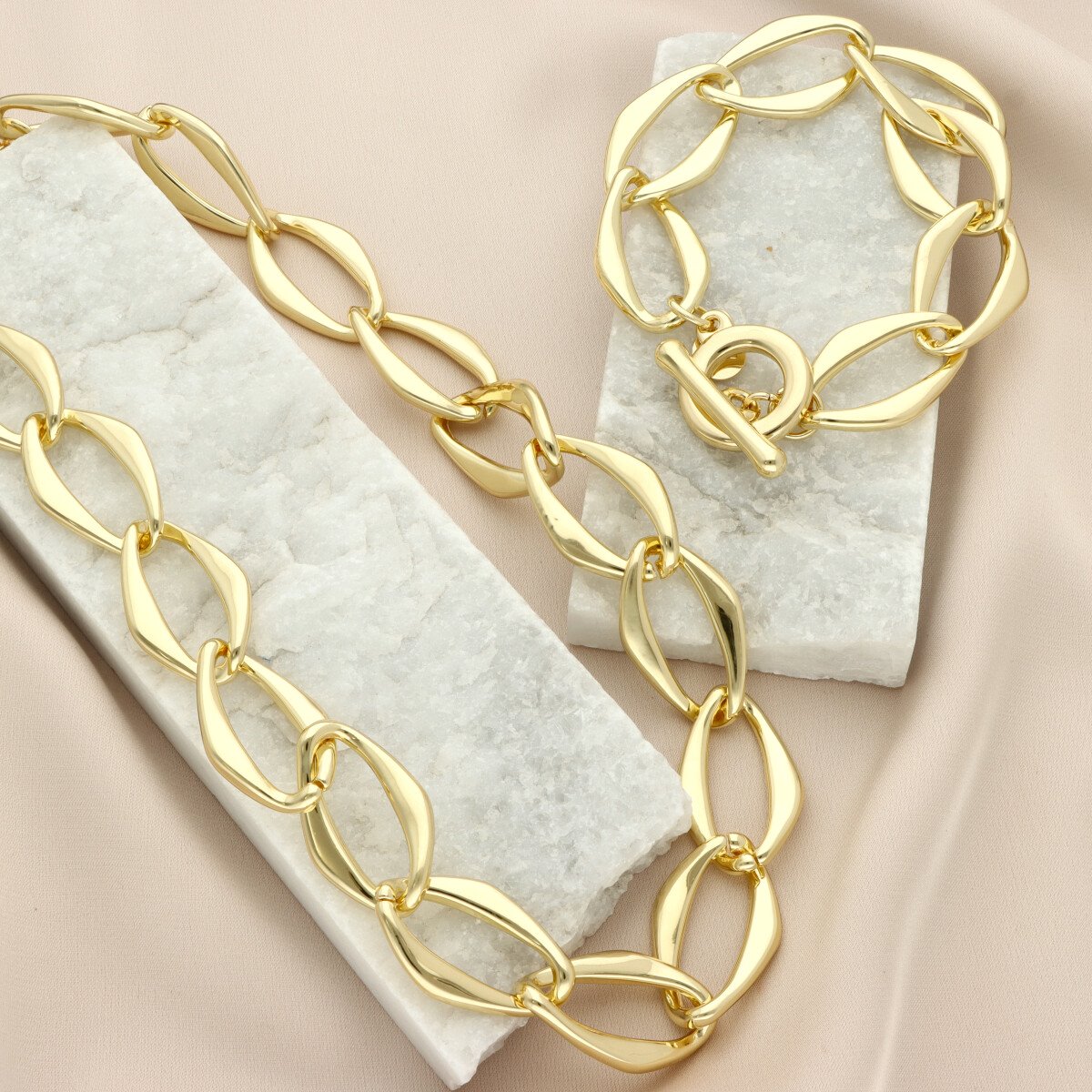 Opis produktu: Efektowny naszyjnik o nowoczesnym, wyrazistym charakterze, wykonany z wysokiej jakości hipoalergicznego metalu (zamak – stop cynku), zapewniającego komfort noszenia oraz trwałość. Model wyróżnia się eleganckim wykończeniem w modnym odcieniu light gold – jasnego, subtelnego złota inspirowanego włoskim stylem biżuterii. To właśnie ten odcień nadaje całości luksusowego, ale jednocześnie bardzo świeżego i współczesnego wyglądu. Tego typu złoto jest obecnie jednym z najmocniejszych trendów – jaśniejsze, bardziej „soft” niż klasyczne żółte złoto. Wyraziste ogniwa tworzą spójną, elegancką formę, która przyciąga uwagę i pięknie układa się na szyi. Naszyjnik doskonale sprawdzi się zarówno w codziennych stylizacjach, jak i w bardziej eleganckich zestawieniach. Do naszyjnika przewidziana jest pasująca bransoletka o tym samym indeksie, tworząca spójny komplet. Długość naszyjnika: 44 cm Materiał: metal hipoalergiczny (zamak)