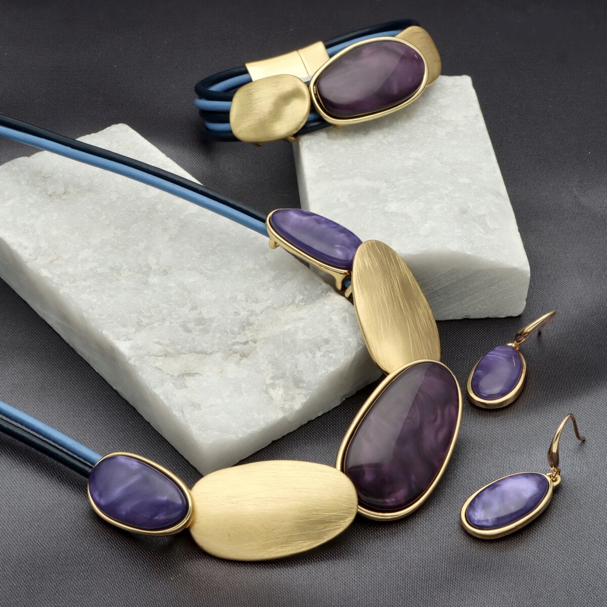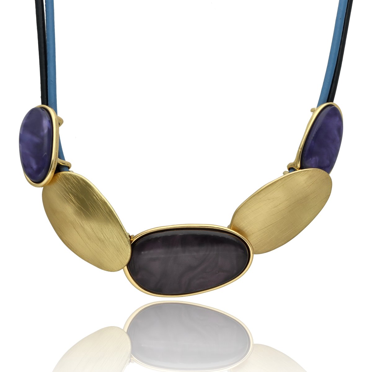 Eleganski dekoltowy naszyjnik, wykonany z żywicy i skóry naturalnej. Długość 45 cm + 8 cm regulacji.