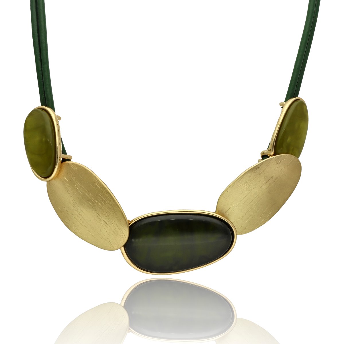 Eleganski dekoltowy naszyjnik, wykonany z żywicy i skóry naturalnej. Długość 45 cm + 8 cm regulacji.