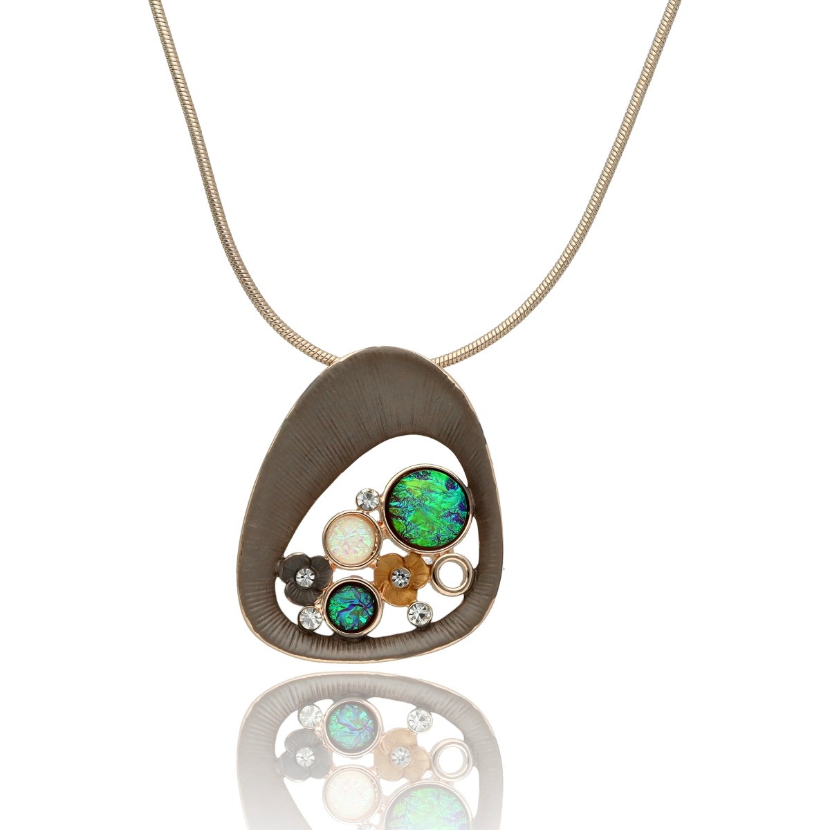 Uroczy, dekoltowy naszyjnik wykonany z antyalergicznego metalu, żywicy jubilerskiej i emalii. Długość 45 cm + 8 cm regulacja. Szukaj do kompletu bransoletki i kolczyków o tym samym indeksie numerycznym.