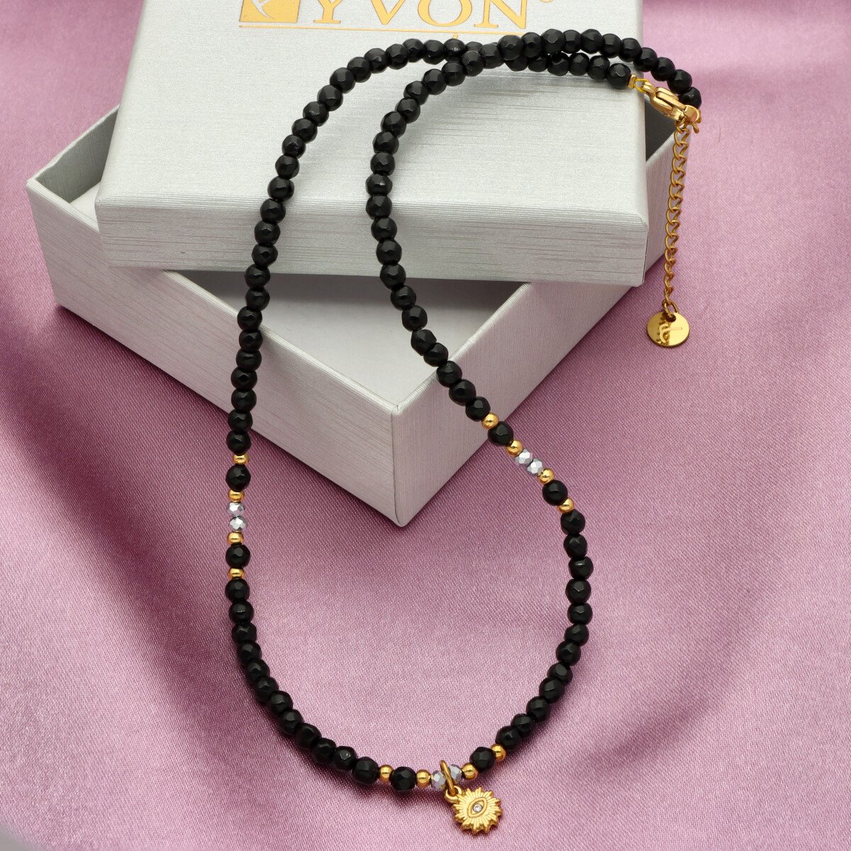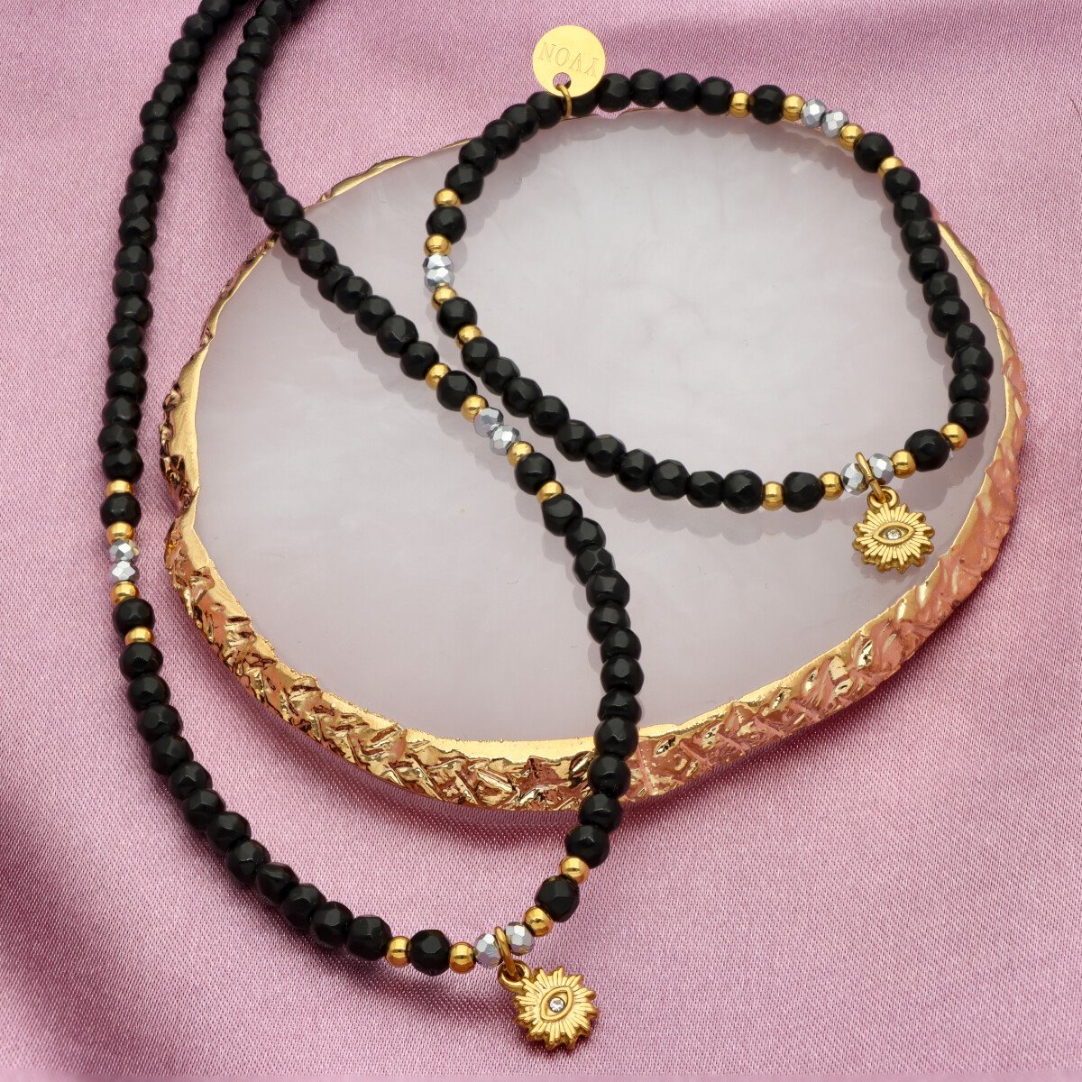 Zjawiskowy naszyjnik wykonany z pozłacanej stali szlachetnej i agatu. Połączenie elegancji z subtelną energią kamieni sprawia, że naszyjnik idealnie dopełnia zarówno codzienne, jak i wieczorowe stylizacje. Długość 40 cm + 5 cm regulacji umożliwia dopasowanie do różnych dekoltów.
