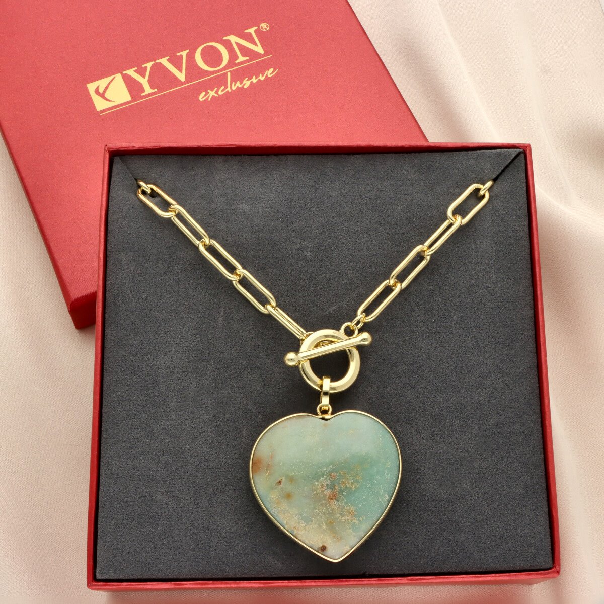 Elegancki, dekoltowy naszyjnik z okazałym amazonitem w kształcie serca. Naturalny kamień wyróżnia się subtelną kolorystyką – odcieniami mięty, błękitu oraz delikatnymi, nieregularnymi przejściami, które podkreślają jego unikalny charakter.