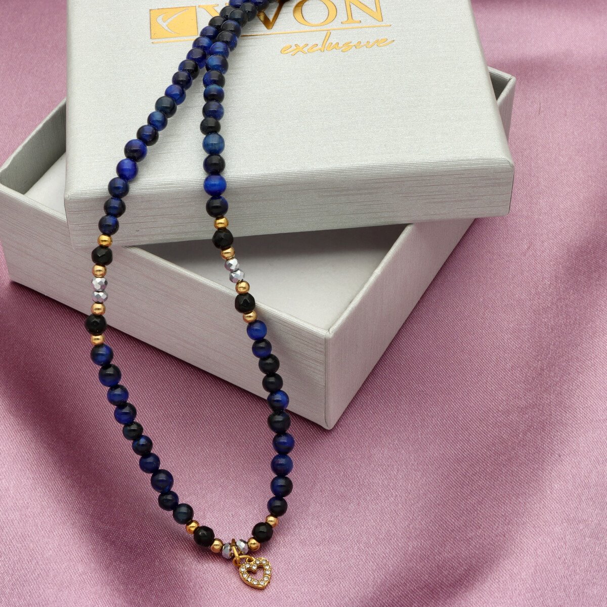 Zjawiskowy naszyjnik wykonany z pozłacanej stali szlachetnej, granatowego tygrysiego oka i agatu. Połączenie elegancji z subtelną energią kamieni sprawia, że naszyjnik idealnie dopełnia zarówno codzienne, jak i wieczorowe stylizacje. Długość 40 cm + 5 cm regulacji umożliwia dopasowanie do różnych dekoltów.