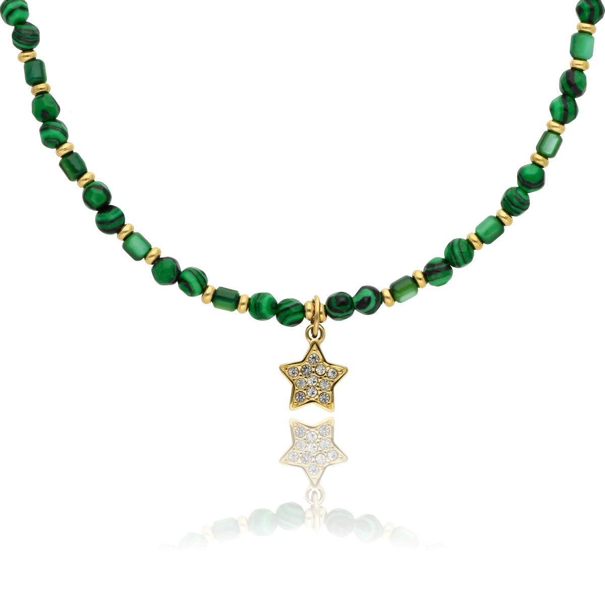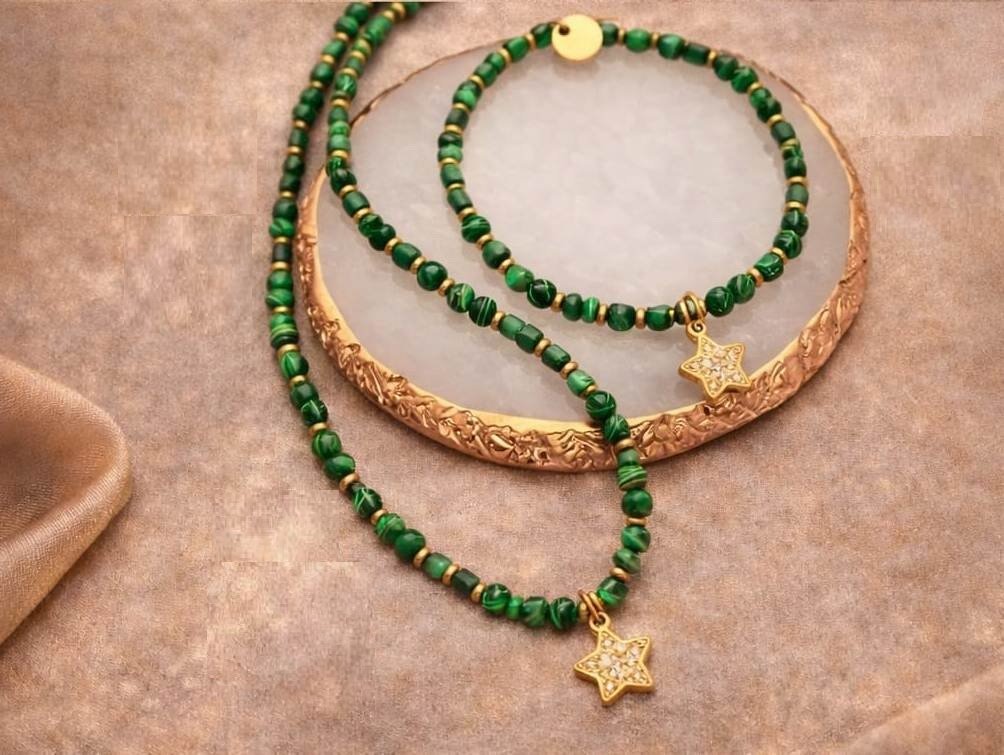 Zjawiskowy naszyjnik wykonany z pozłacanej stali szlachetnej, imitacji malachitu i muszli. Połączenie elegancji z subtelną energią kamieni sprawia, że naszyjnik idealnie dopełnia zarówno codzienne, jak i wieczorowe stylizacje. Długość 40 cm + 5 cm regulacji umożliwia dopasowanie do różnych dekoltów.