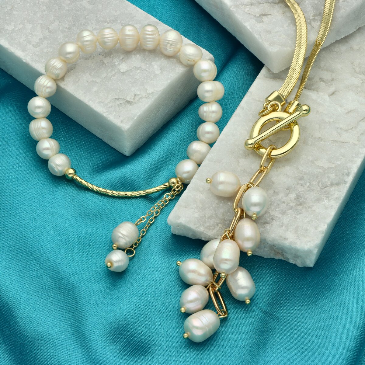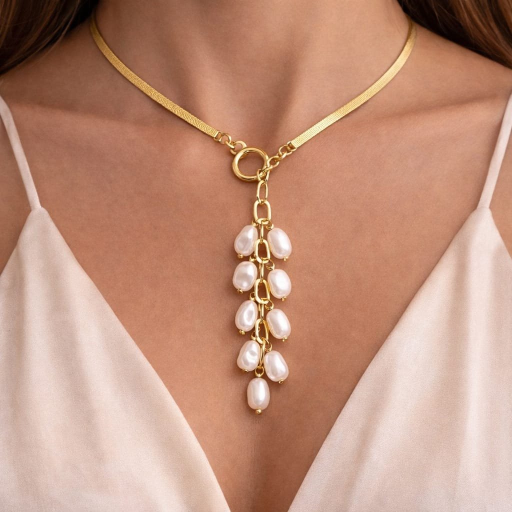 Elegancki naszyjnik z naturalnymi perłami o nieregularnym, organicznym kształcie. Perły wyróżniają się subtelnym, kremowo-białym odcieniem z delikatnym, perłowym połyskiem, który nadaje całości luksusowego i ponadczasowego charakteru.