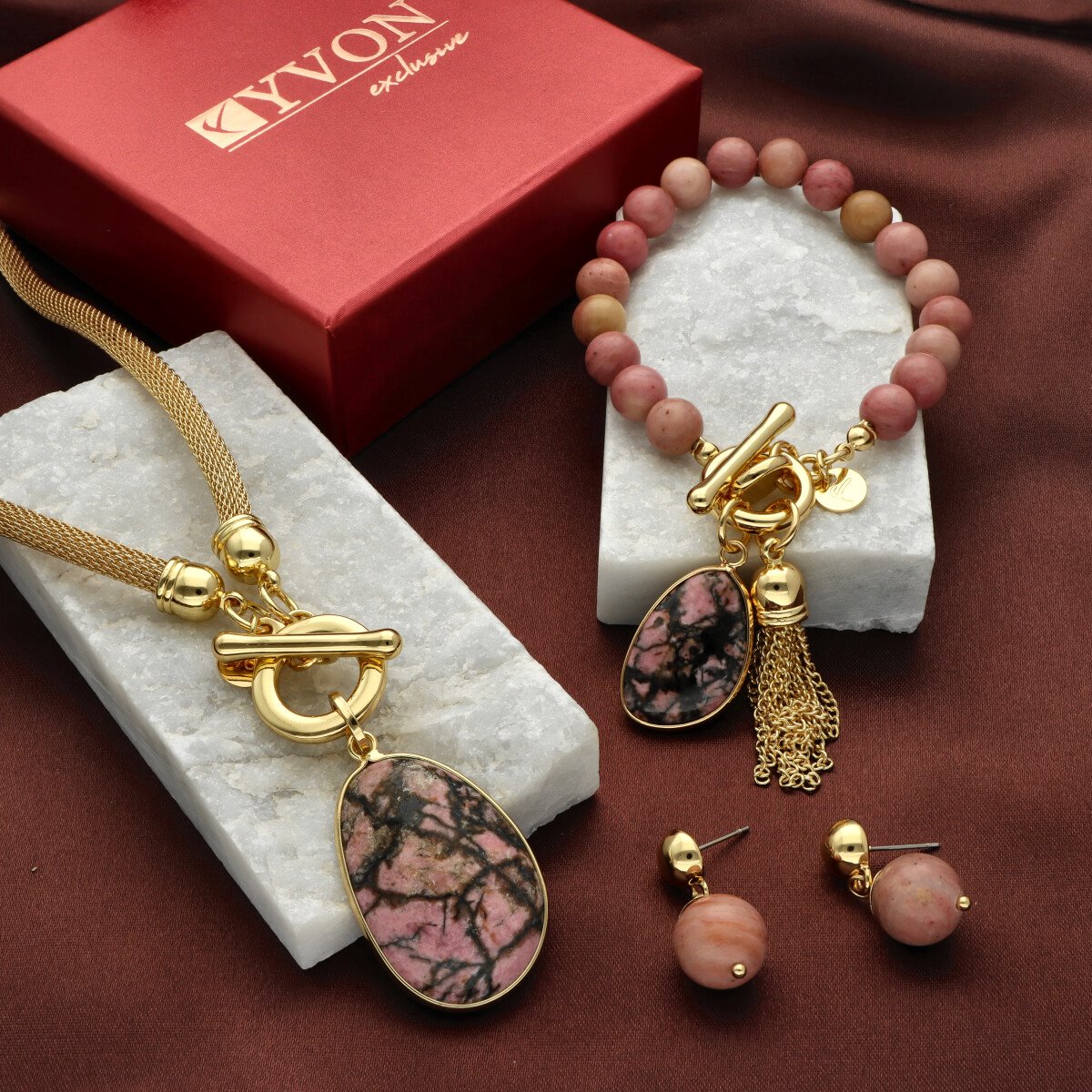 Elegancki, dekoltowy naszyjnik z okazałym rodonitem. Wykonany z wysokiej jakości metalu hypoalergicznego (zamak). Długość: ok 45 cm.