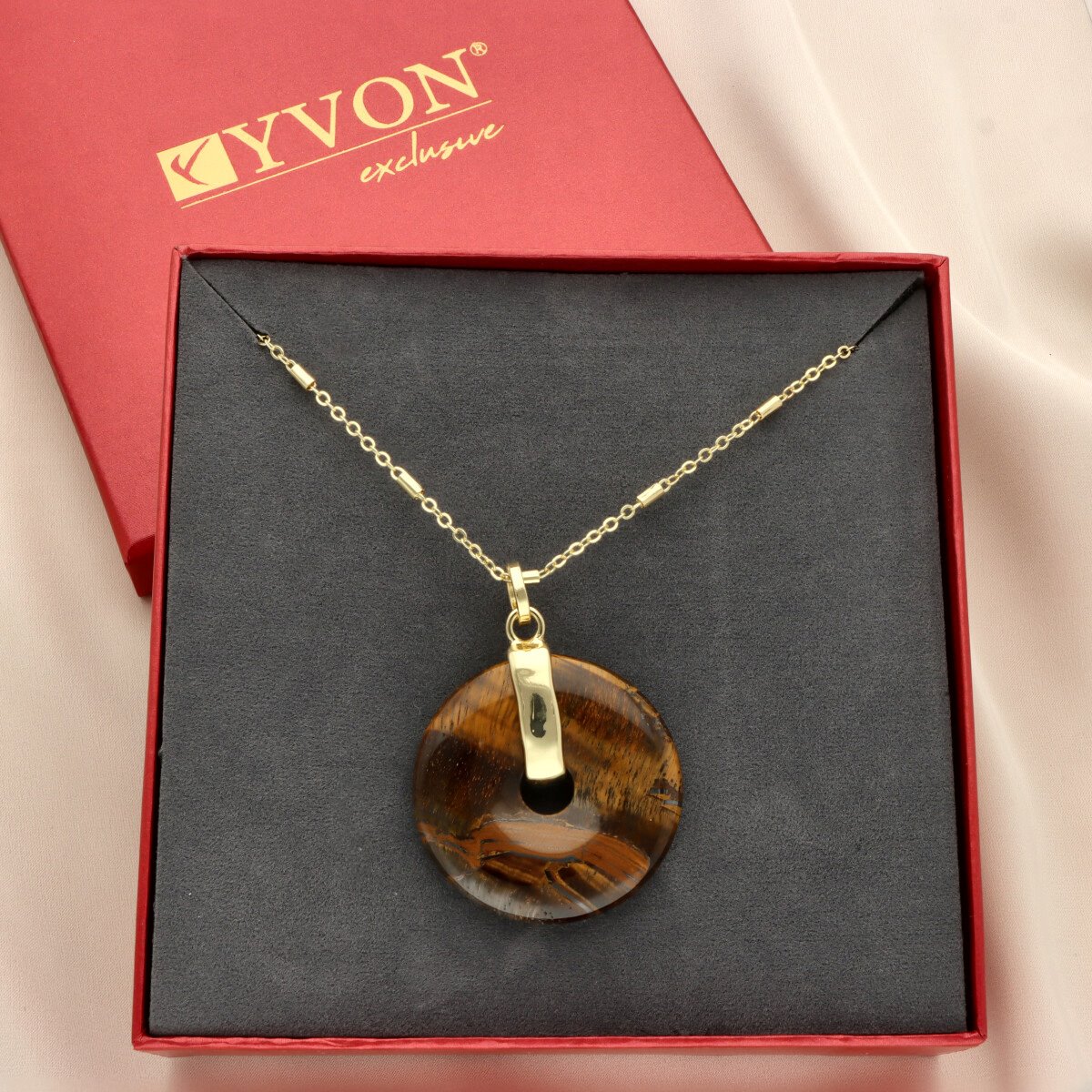 Elegancki naszyjnik z naturalnym kamieniem tygrysie oko (Tiger Eye) w formie efektownej, okrągłej zawieszki. Kamień wyróżnia się głęboką, złoto-brązową kolorystyką z charakterystycznym, jedwabistym połyskiem i refleksami światła.