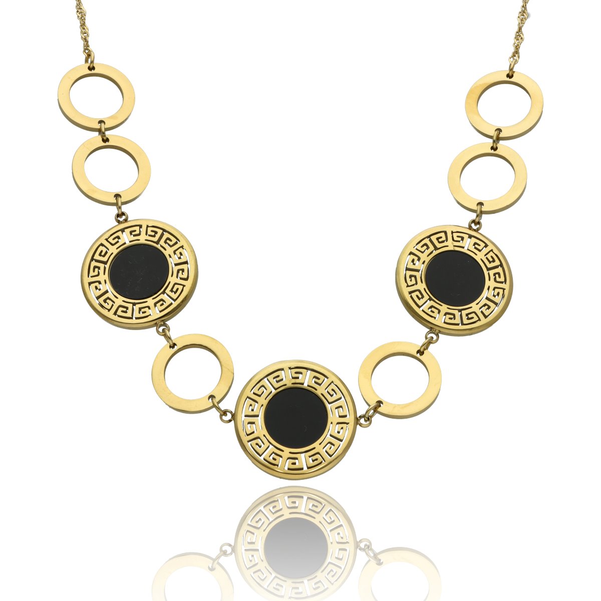 Naszyjnik wykonany z hipoalergicznej stali szlachetnej 316L, pozłacanej 16-karatowym złotem. Model składa się z połączonych okrągłych elementów o średnicy od 14 do 30 mm, tworzących efektowny, geometryczny układ.