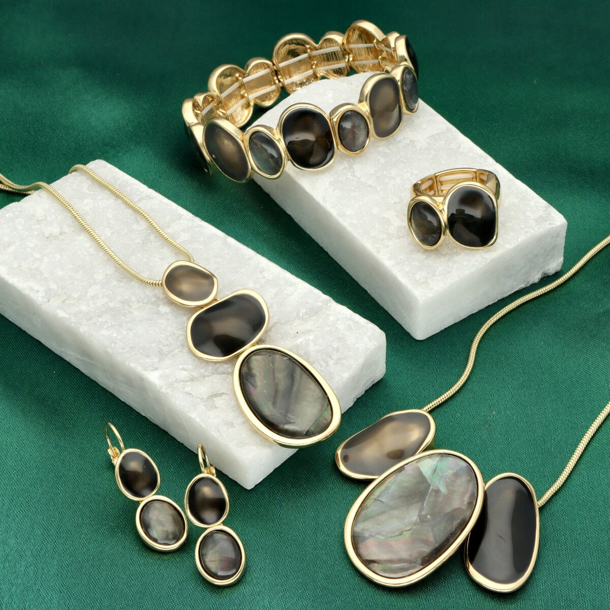 Elementy dekoracyjne zostały stworzone z barwnej żywicy, emalii oraz naturalnej muszli abalone, której opalizujące refleksy nadają biżuterii wyjątkowy charakter. Doskonały wybór zarówno na co dzień, jak i na specjalne okazje.