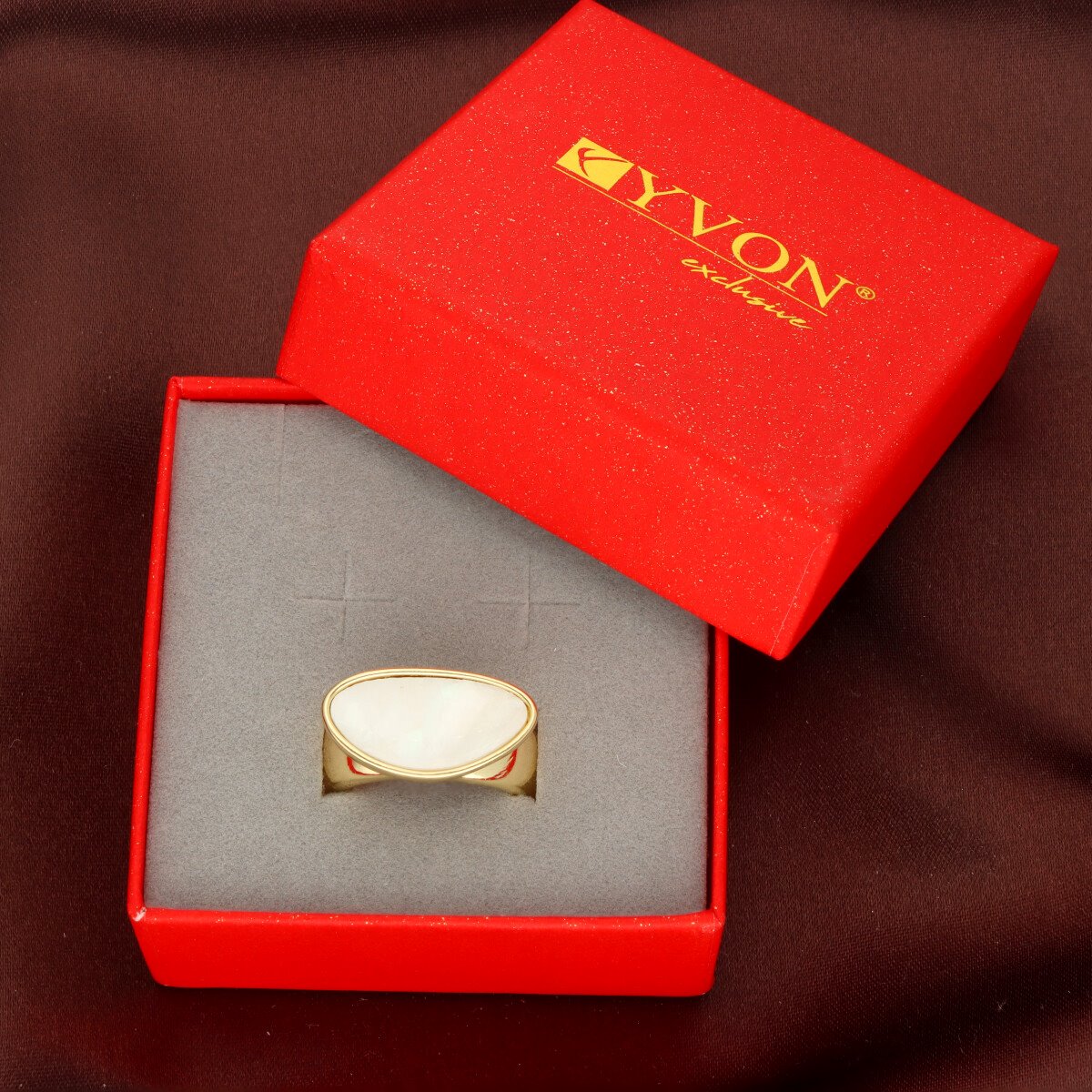 Elegancki pierścionek / damski sygnet wykonany z metalu antyalergicznego – bezpieczny nawet dla wrażliwej skóry, ozdobiony naturalną muszlą mleczną.