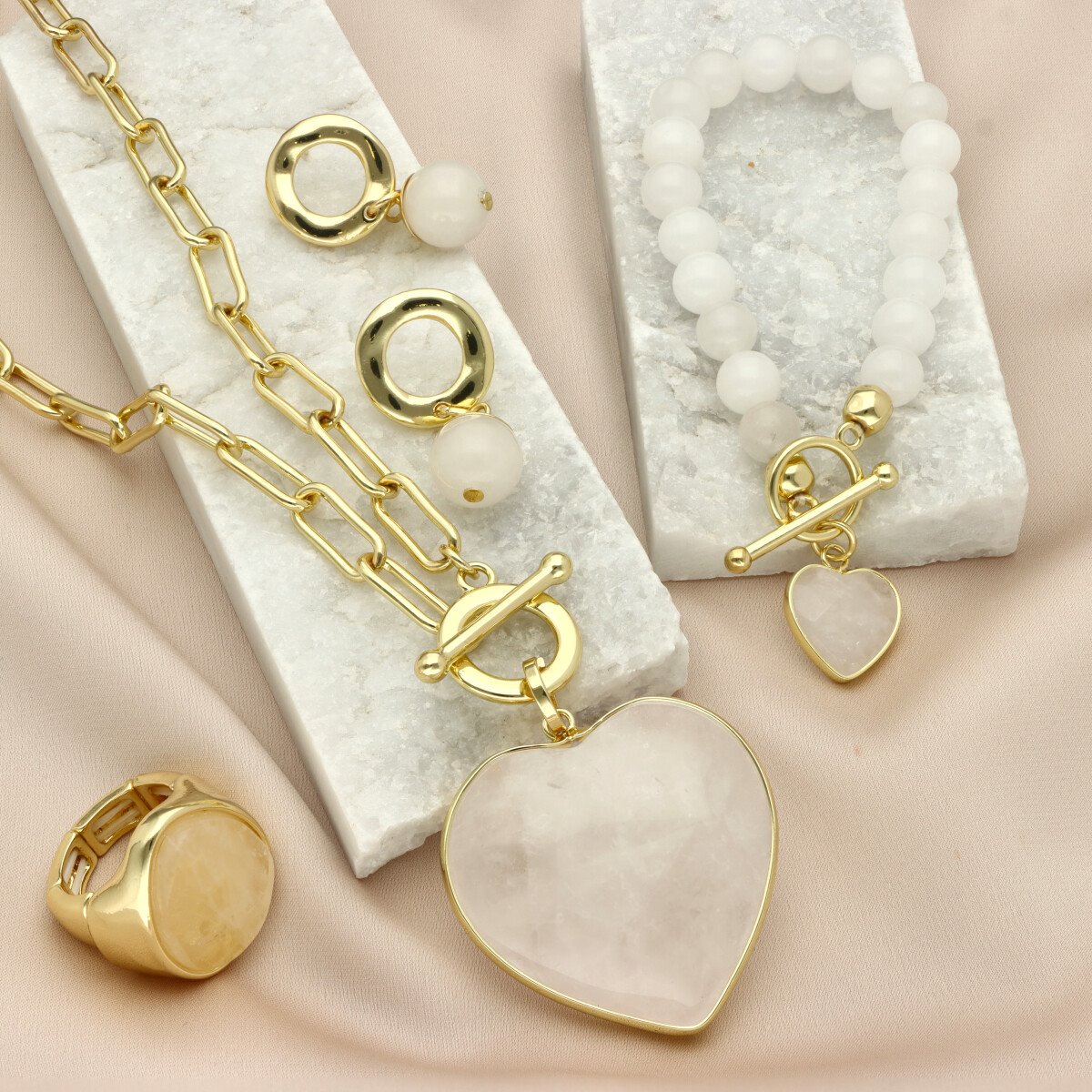 Wyrazisty pierścionek z naturalnym jadeitem mlecznym to elegancki akcent całego zestawu. Gładko szlifowany kamień o subtelnym połysku i kremowej, półtransparentnej barwie pięknie komponuje się ze złotą oprawą, tworząc ponadczasową, szlachetną formę.