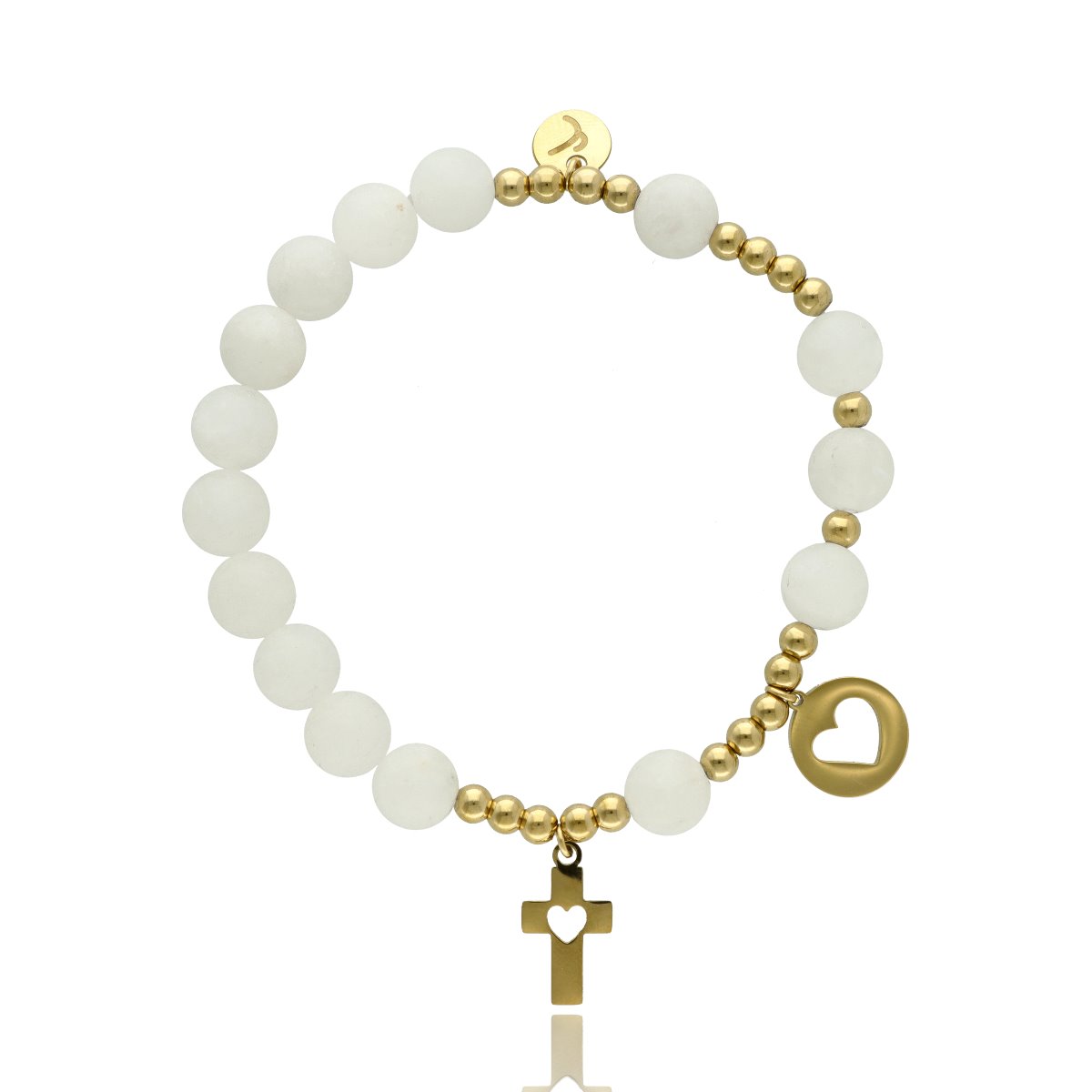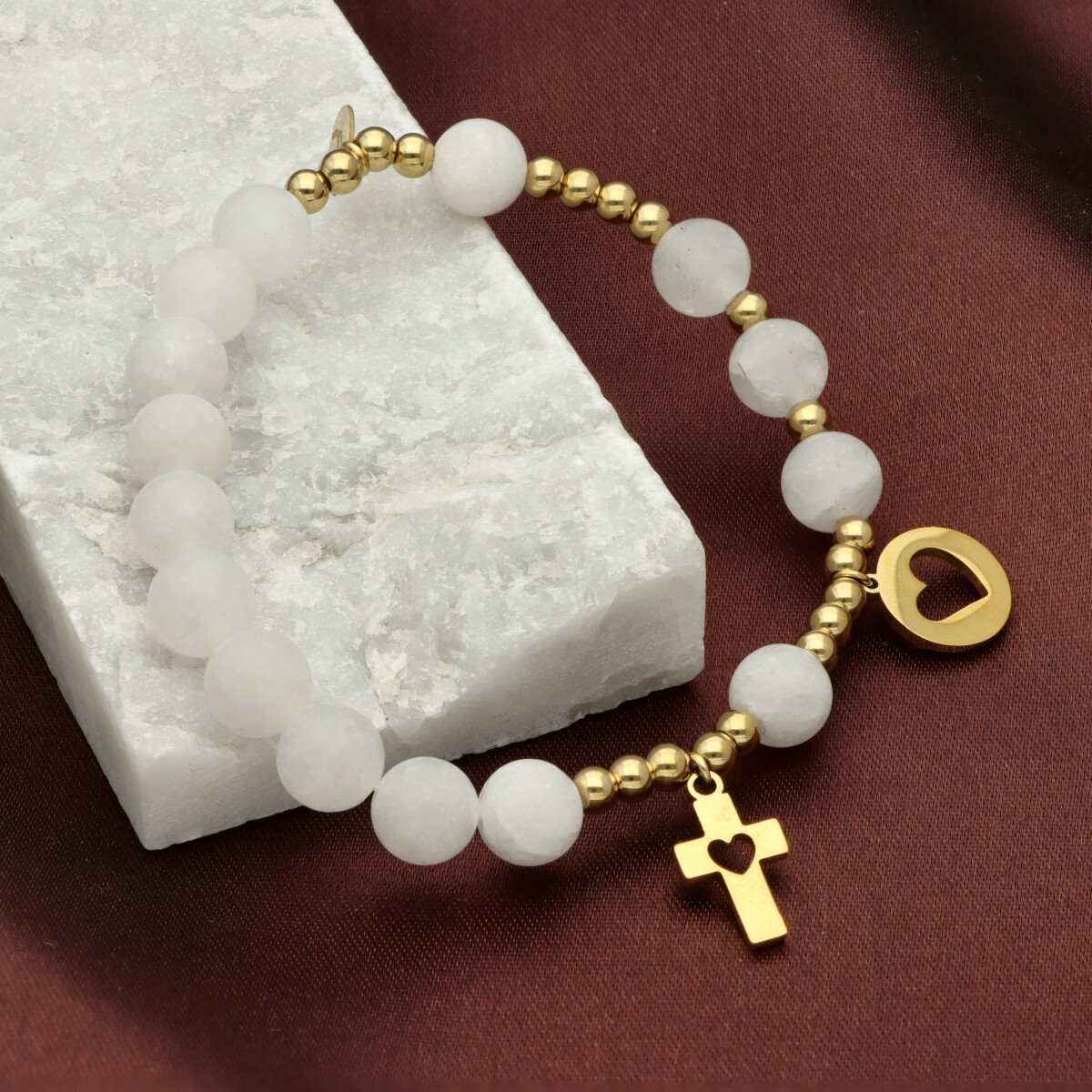 Różaniec wykonany z naturalnych kamieni (AGAT BIAŁY) oraz ze stali szlachetnej 316L, złoconej trwałą metodą PVD. To elegancka, solidna biżuteria o ponadczasowym charakterze — idealna jako osobista ozdoba lub prezent.