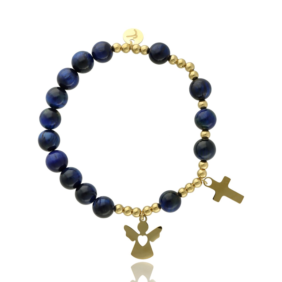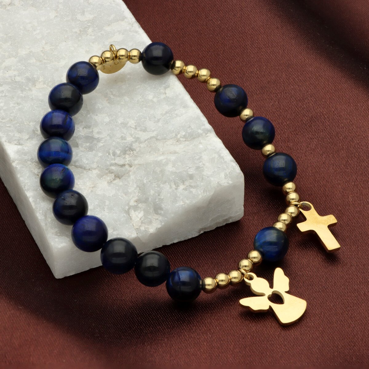 Różaniec wykonany z naturalnych kamieni (NIEBIESKIE TYGRYSIE OKO) oraz ze stali szlachetnej 316L, złoconej trwałą metodą PVD. To elegancka, solidna biżuteria o ponadczasowym charakterze — idealna jako osobista ozdoba lub prezent.