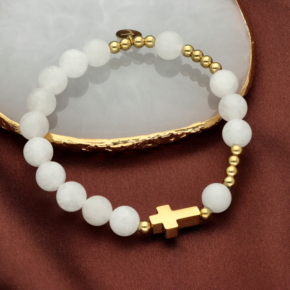 Różaniec na rękę damski, wykonany ze stali szlachetnej złoconej i kamieni naturalnych (agat mleczny matowy). Wielkość kamieni: 8 mm Zestaw w eleganckim pudełku i z sakiewką GRATIS. Idealny pomysł na Komunię Świętą.